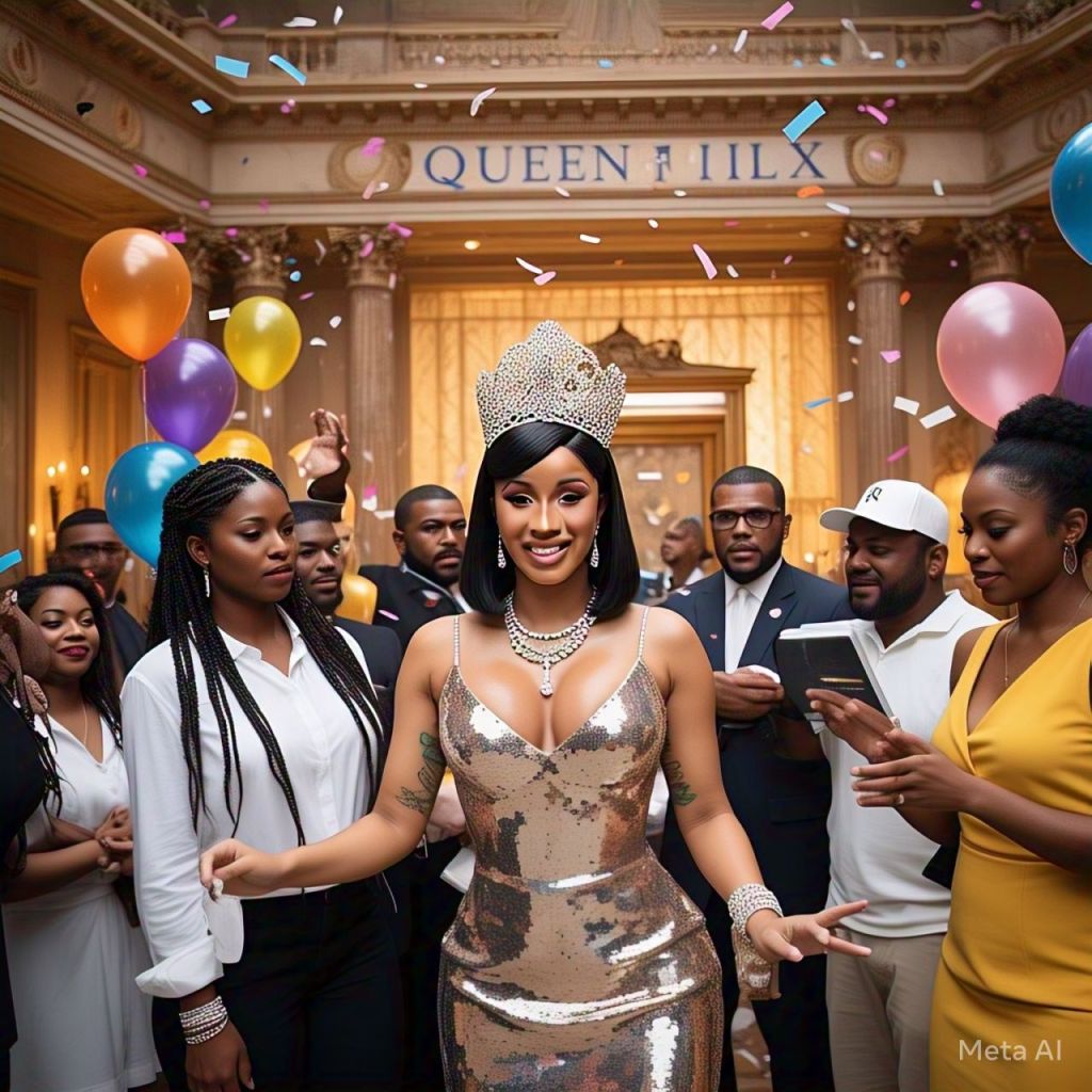 (Queenflix HQ is alive with hood-style banter and the sound of Cardi B’s iconic laugh as she struts in, wearing a glittering, golden robe with “Queen Approved” bedazzled on the back.)