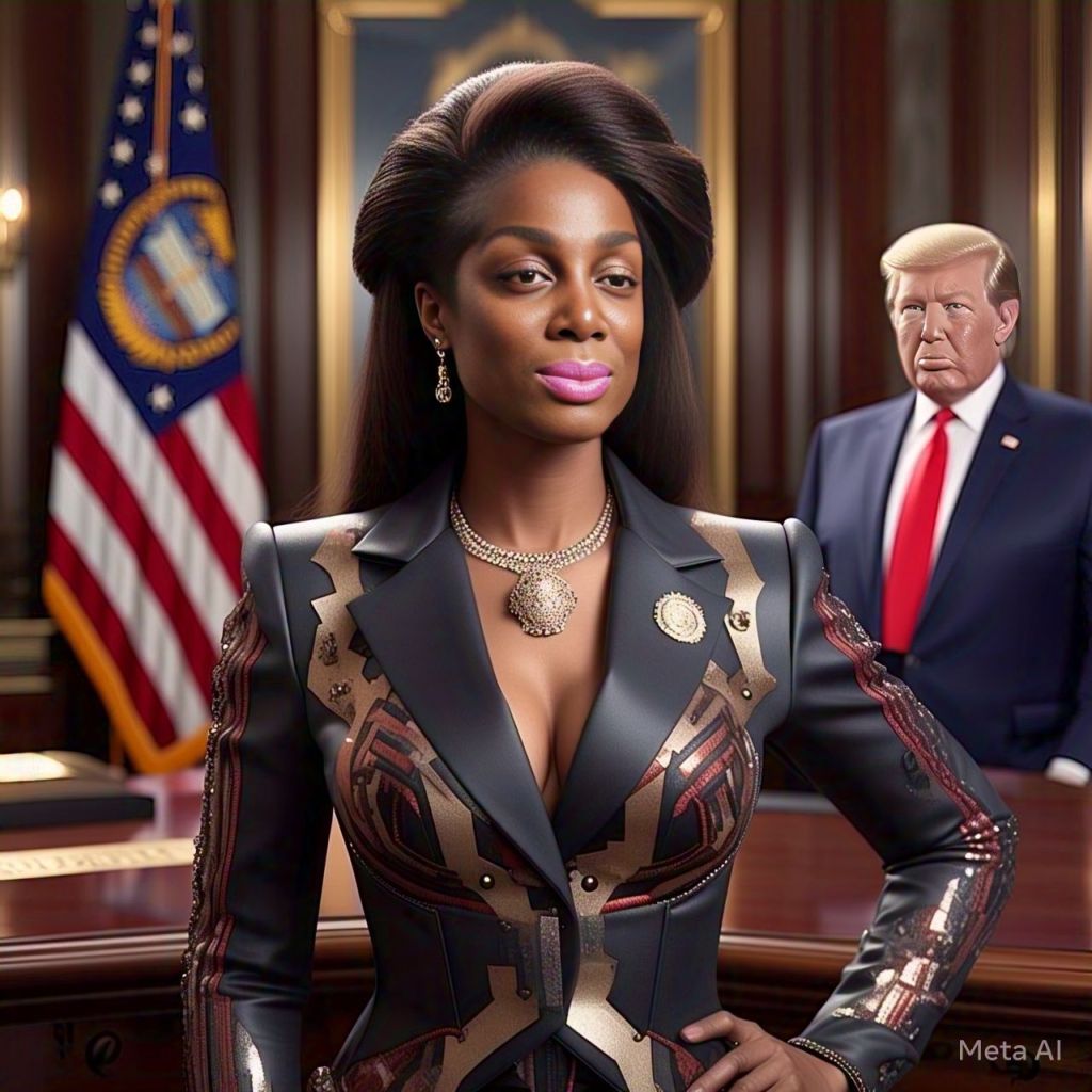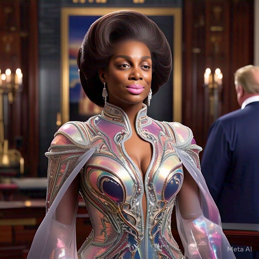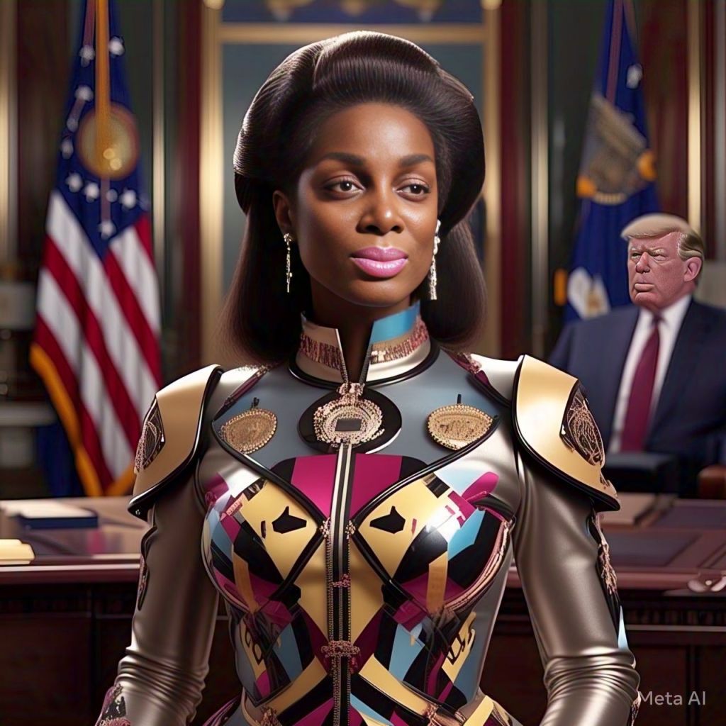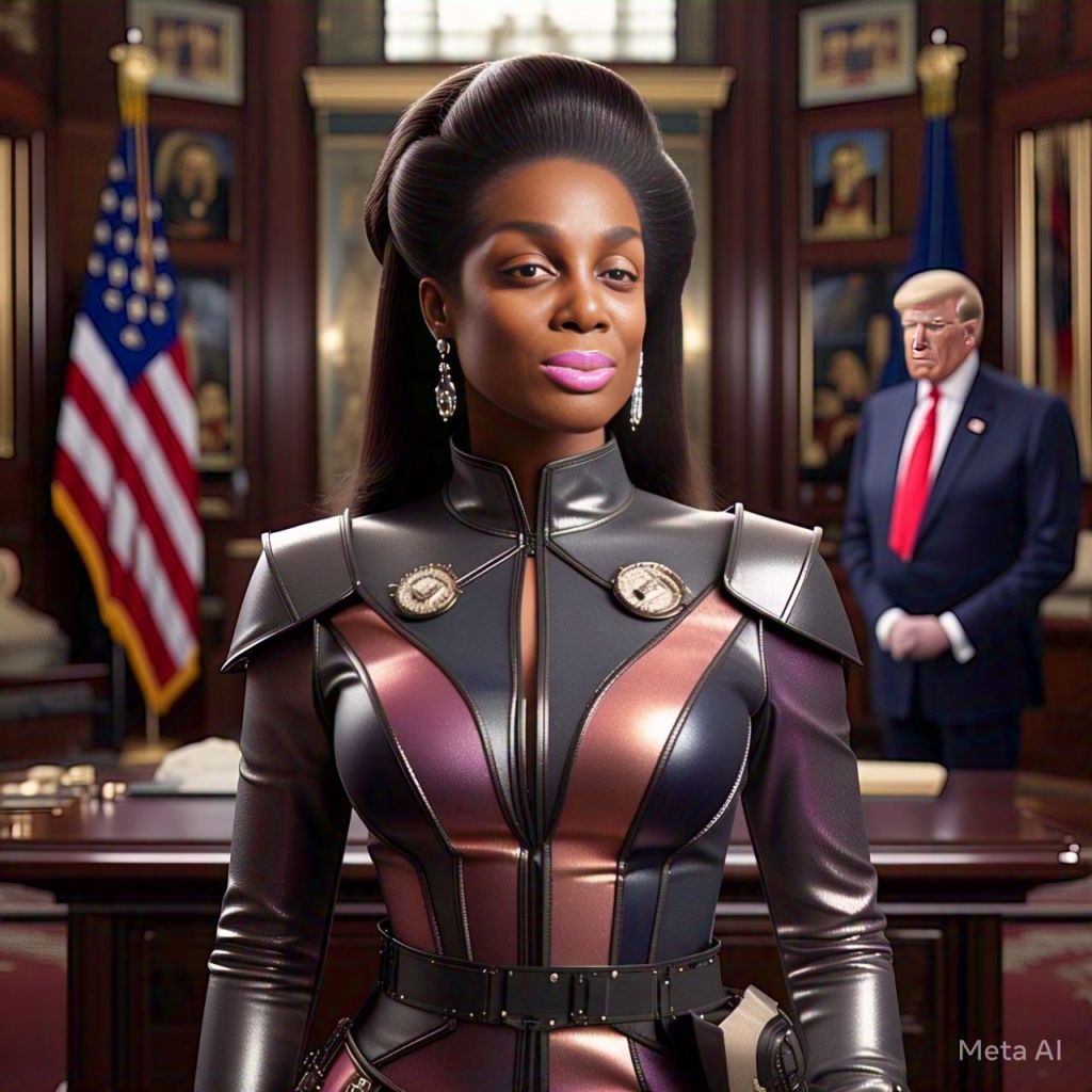 [Cut to President Trump sitting across from her, looking a little confused but trying to keep his cool. He’s dressed in his usual suit but it looks a little… outdated, next to Antoinette’s futuristic vibe. He adjusts his tie and takes a deep breath.]