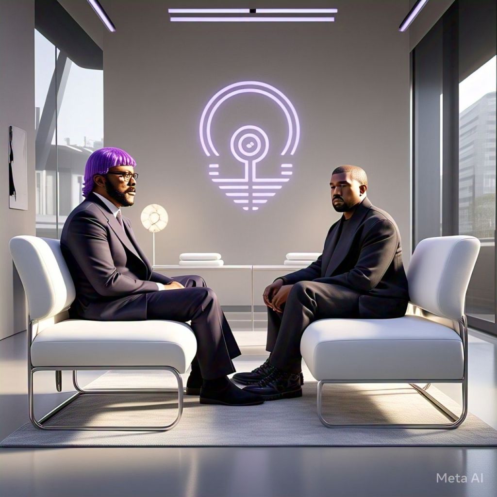 [Scene opens. Kanye West is sitting in an oversized chair wearing all beige, shades on, and a giant cross chain. Tyler Perry walks in dressed half-Madea, half-Mogul.]