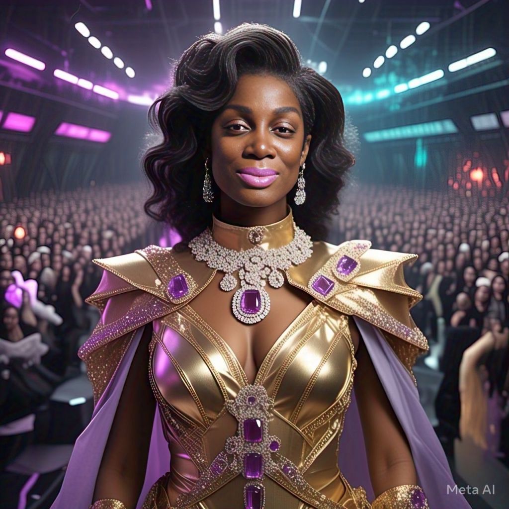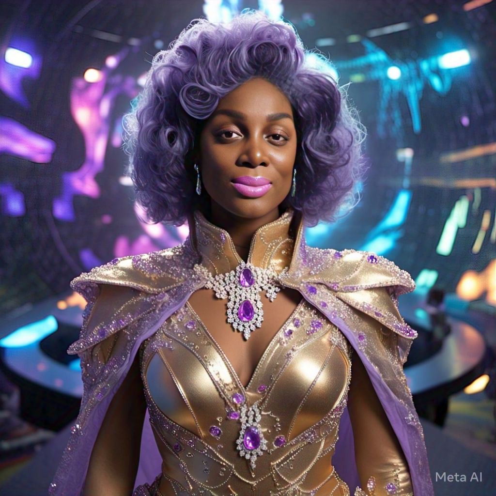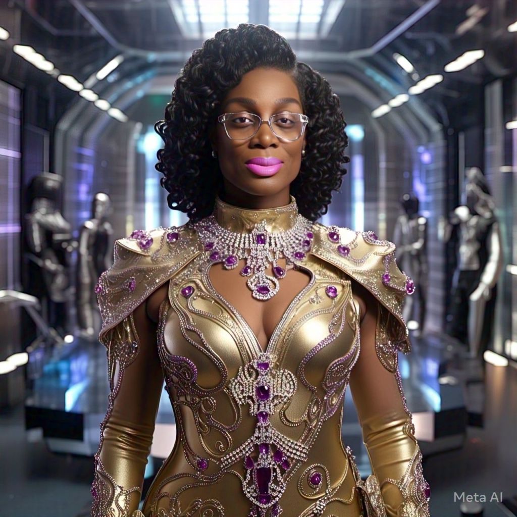 Panel 1: Chair fades. Antoinette is floating in a white crystal chamber. Caption: “You’re not ready yet, My child.” Panel 2: She snaps out. Frequency beeps. Touches her temple. Panel 3: Over-the-shoulder shot. Assistant on holo-screen: “Your haters are here.” Panel 4: Antoinette walks confidently. Her outfit transforms into protective glam-suit.
