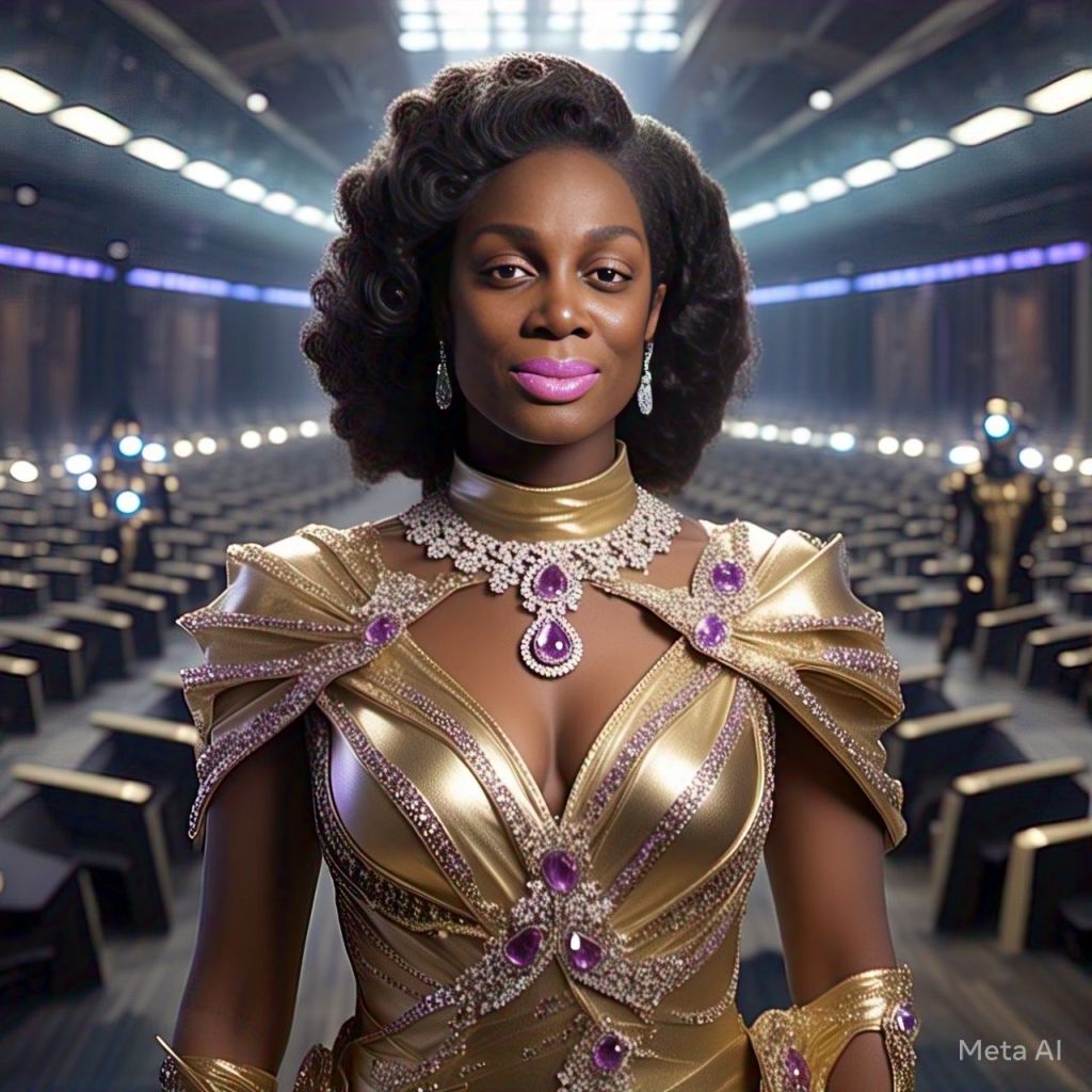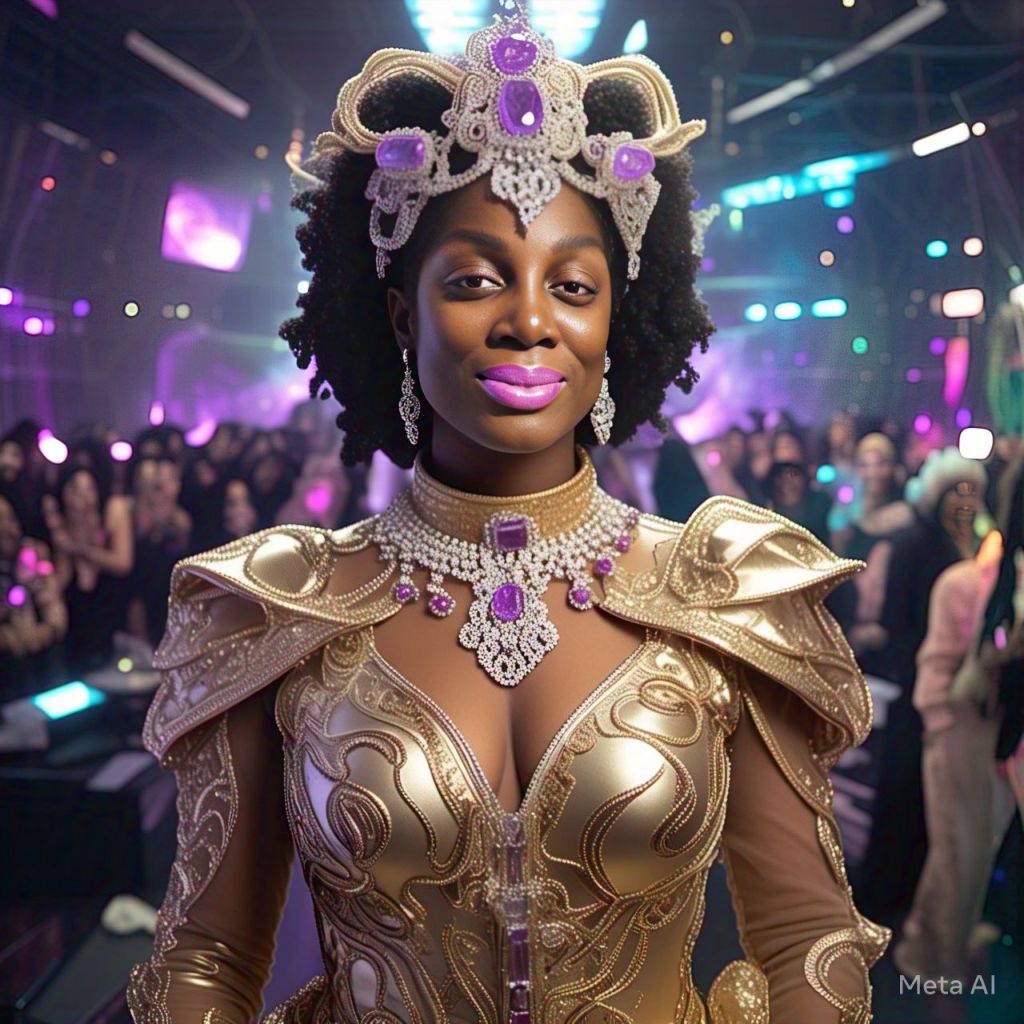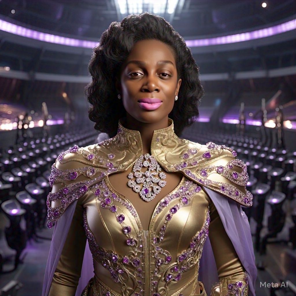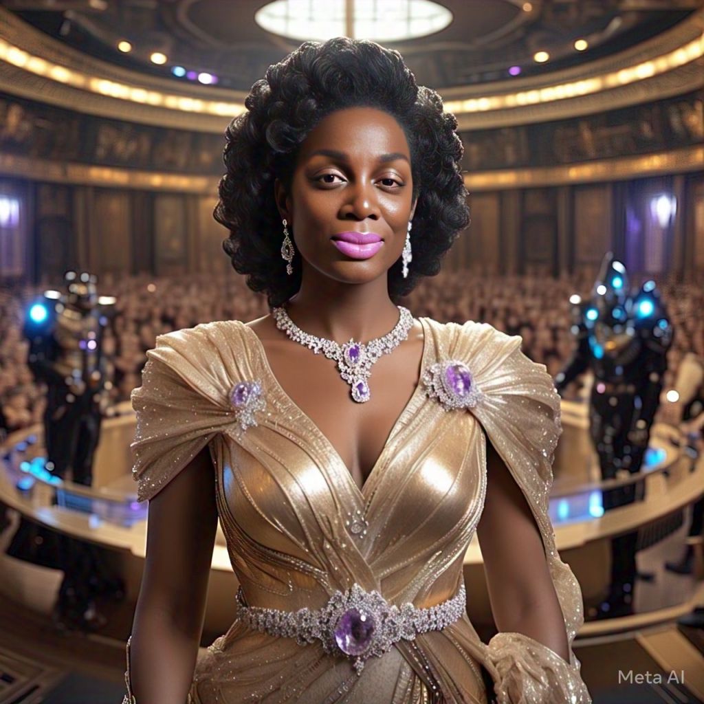 Panel 1: Chair fades. Antoinette is floating in a white crystal chamber. Caption: “You’re not ready yet, My child.” Panel 2: She snaps out. Frequency beeps. Touches her temple. Panel 3: Over-the-shoulder shot. Assistant on holo-screen: “Your haters are here.” Panel 4: Antoinette walks confidently. Her outfit transforms into protective glam-suit.
