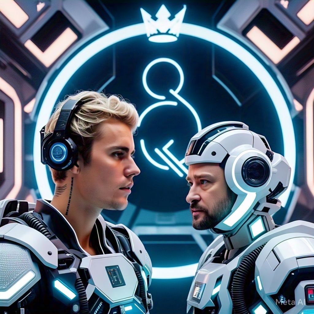 Justin Bieber vs. Justin Timberlake on a futuristic dance-off stage.