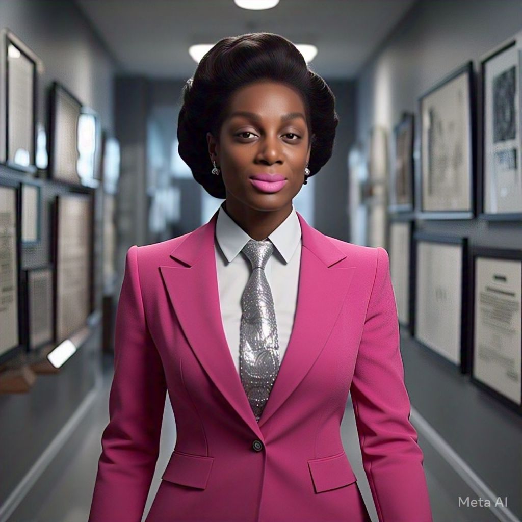 Camera zooms in on Antoinette walking down a hallway full of framed contracts and golden headphones.