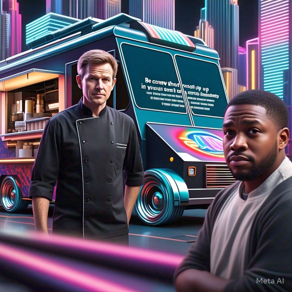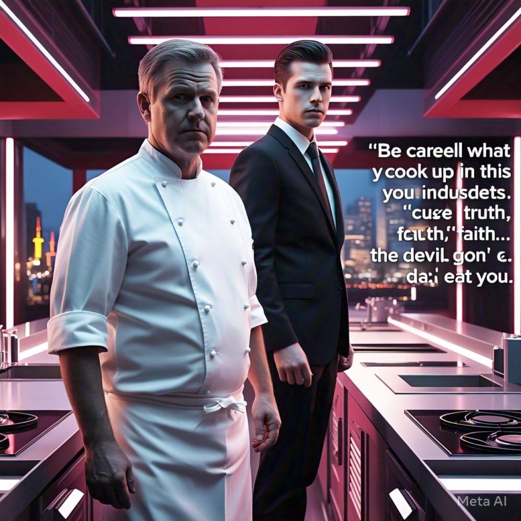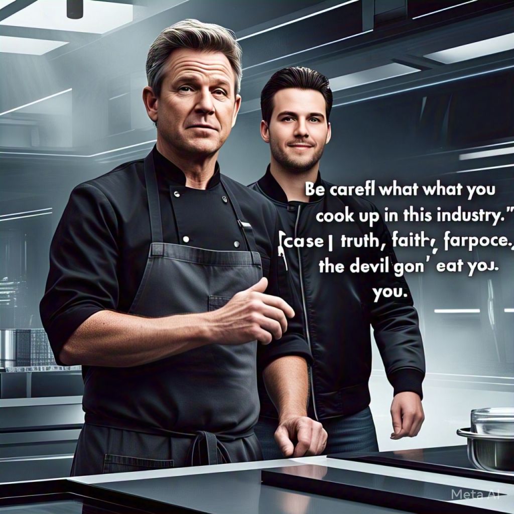 The kitchen is glamorously demonic. Think: Hell’s Kitchen meets Fashion Week. There’s fire, flair, and fake A&R execs frying oaths over open flame. A neon sign glows: “SIGN HERE FOR FAME.”