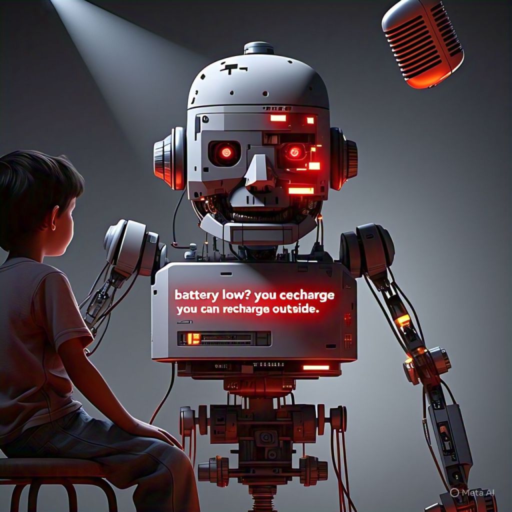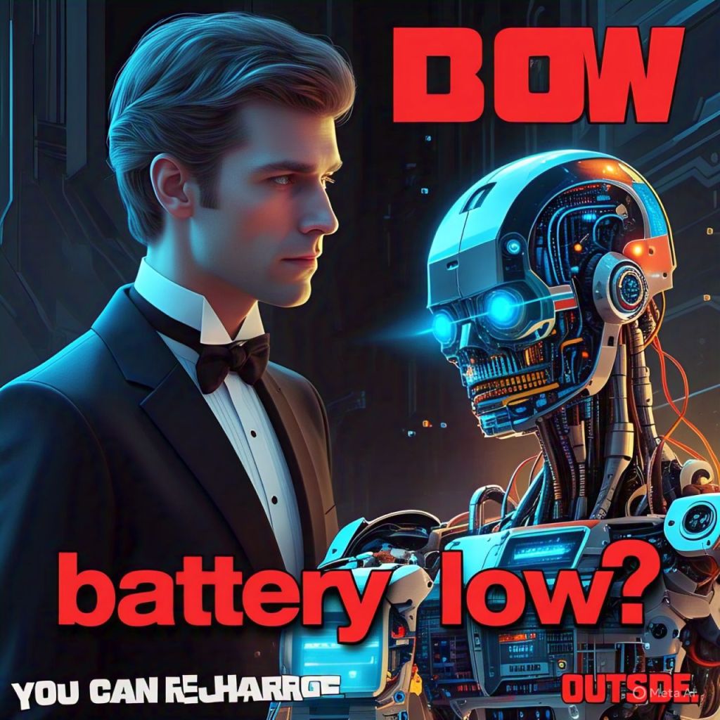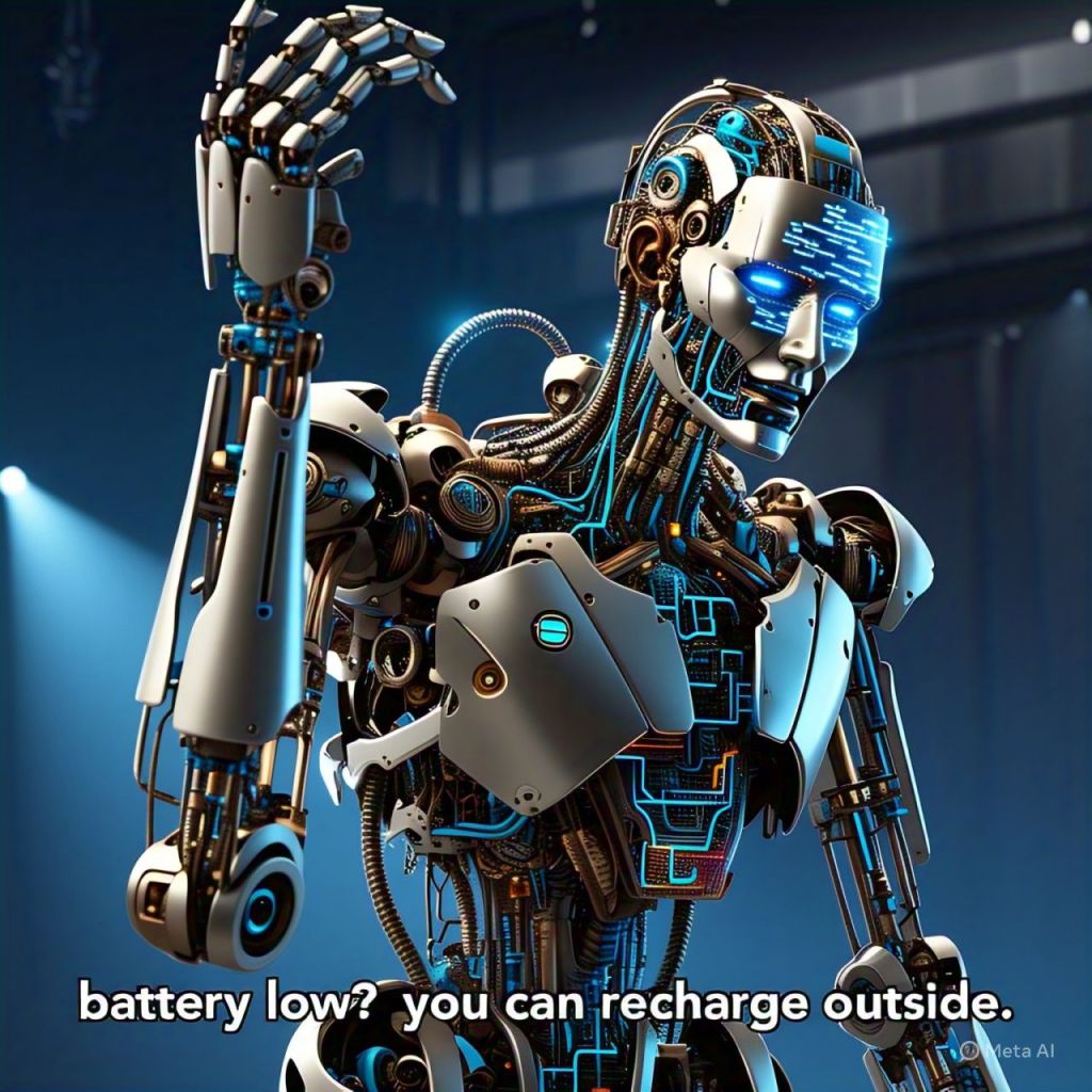 A robot actor shows up glitching and you politely say, “Battery low? You can recharge outside.”