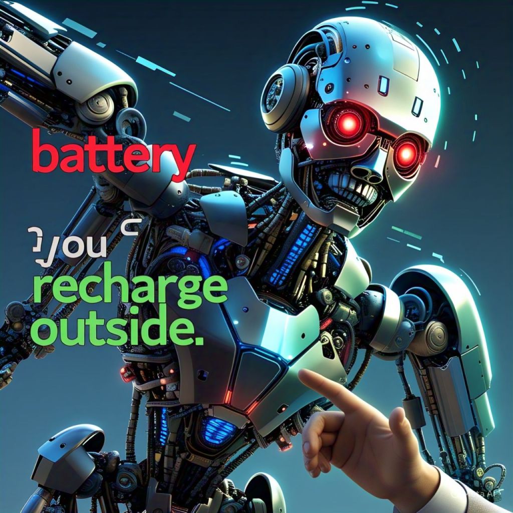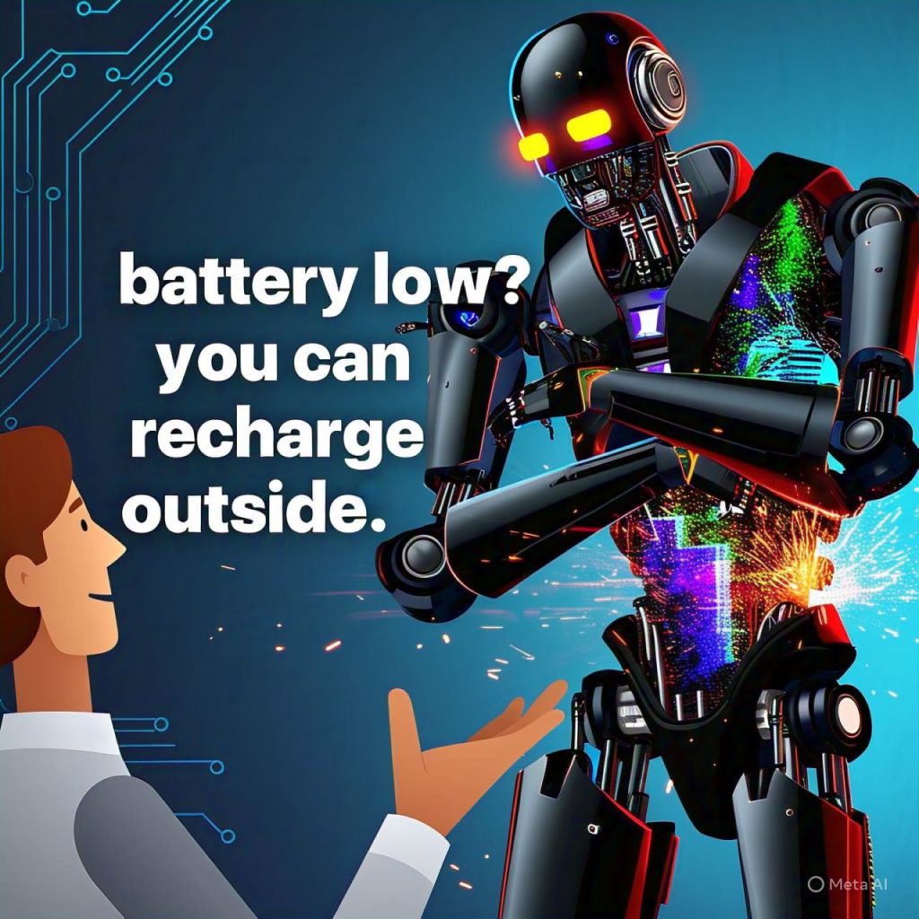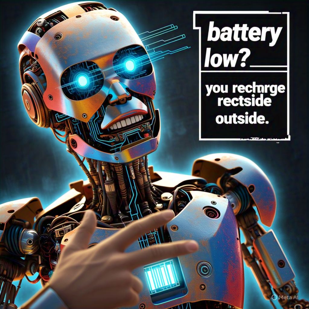 A robot actor shows up glitching and you politely say, “Battery low? You can recharge outside.”