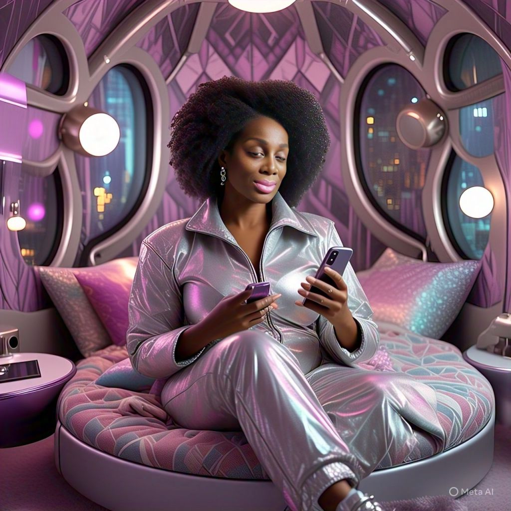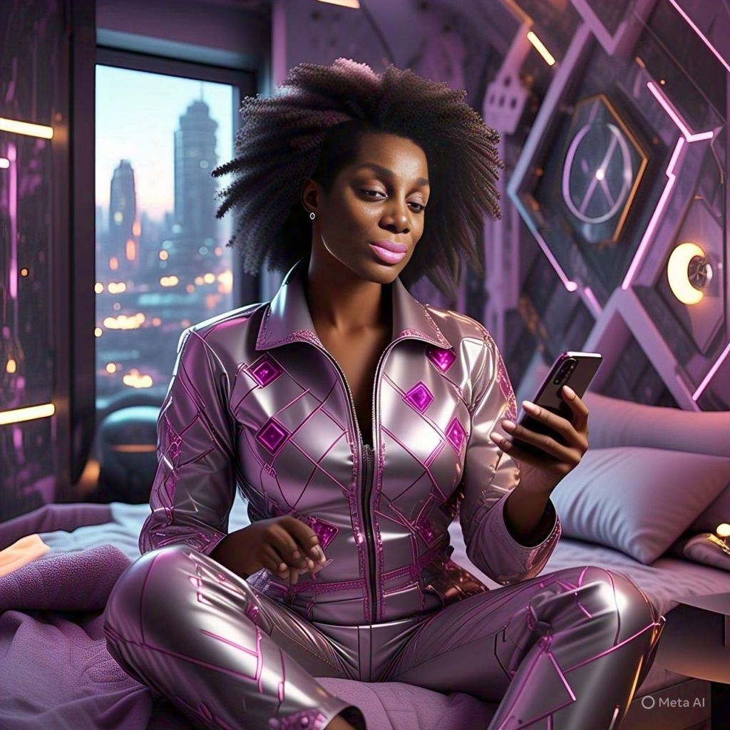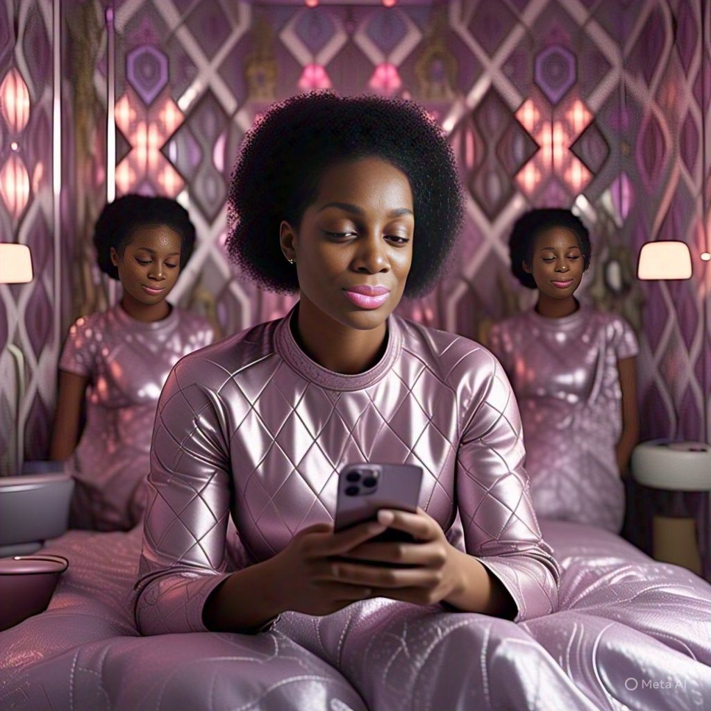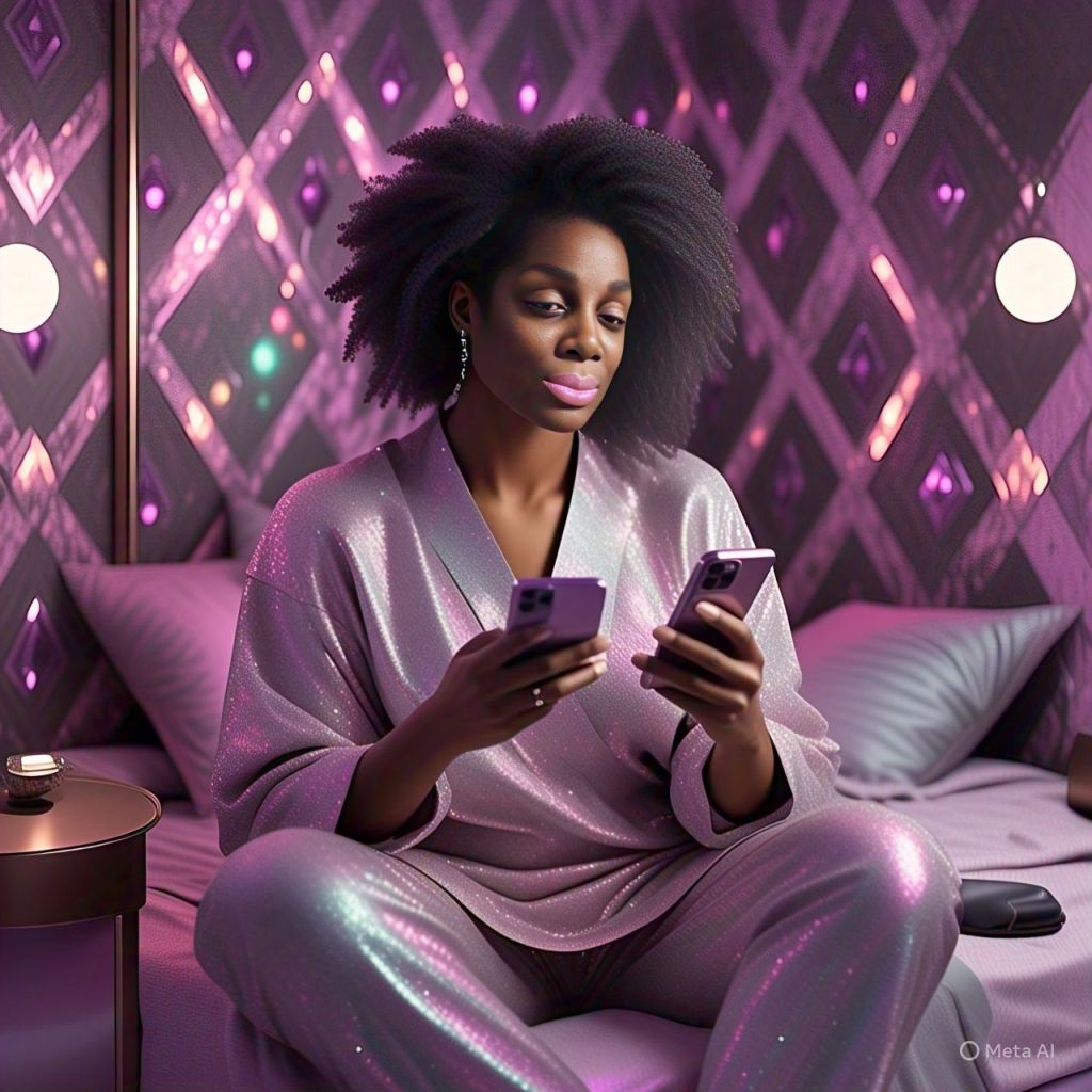 Antoinette, Michelle, and Danielle sit in custom lavender power suits on a 3-screen call with Paris, Dubai, Johannesburg.