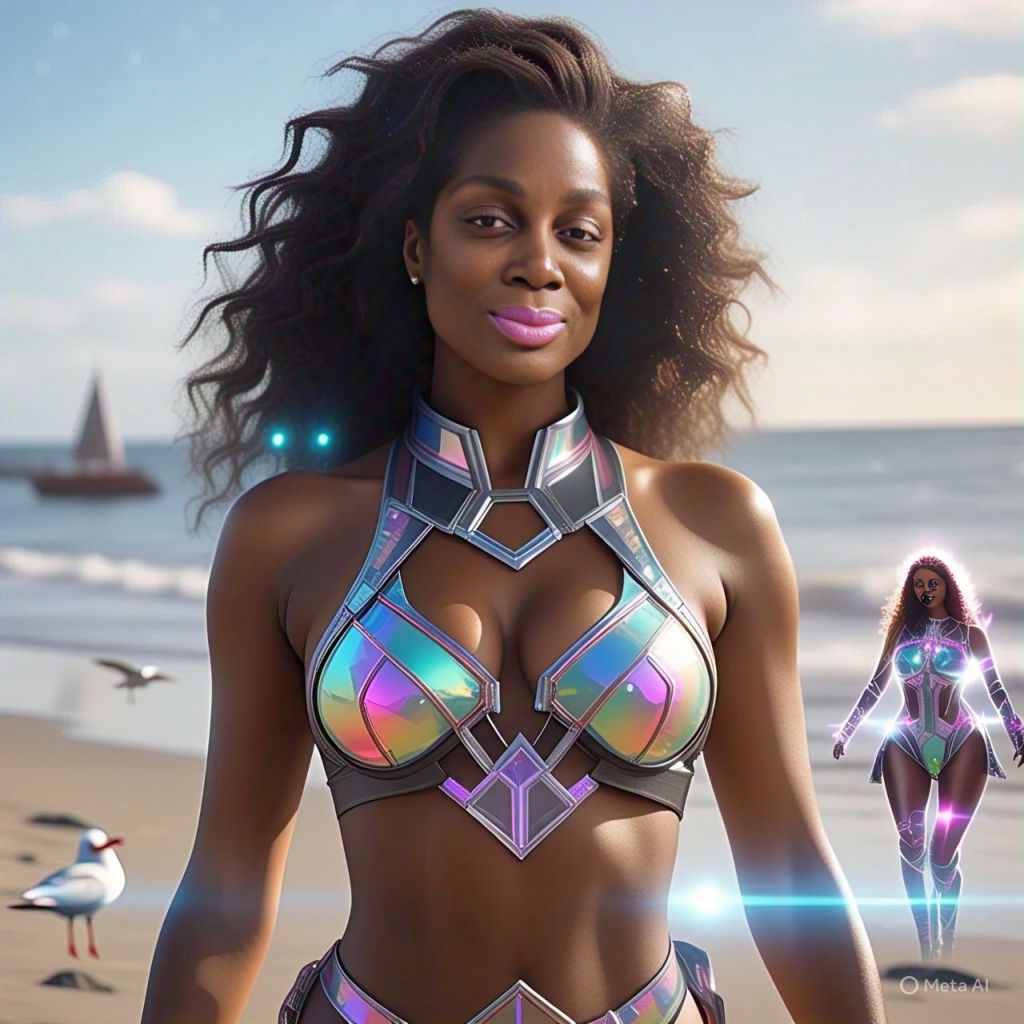 She walks alone. The waves crash gently. AuroraNova appears beside her one last time—smiling.
