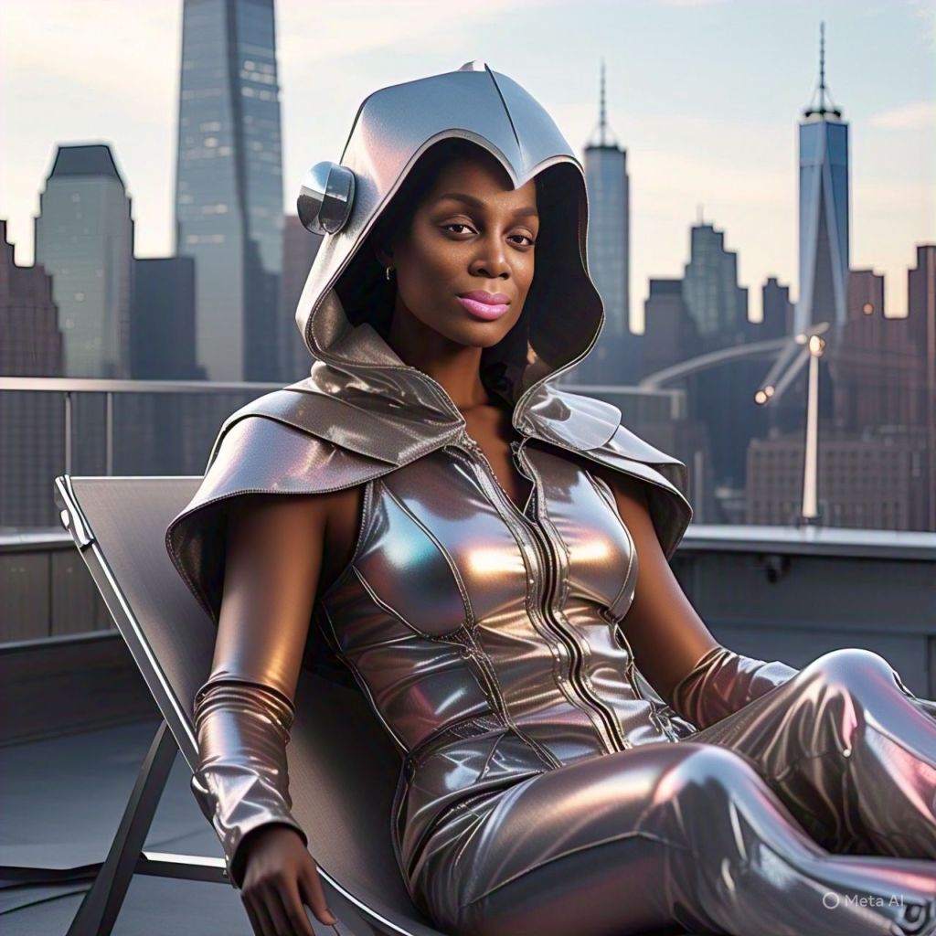 Antoinette appears. In a custom lavender trench, crown of LED circuitry on her head, mic in hand.