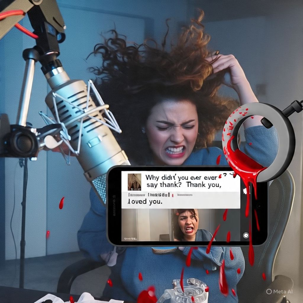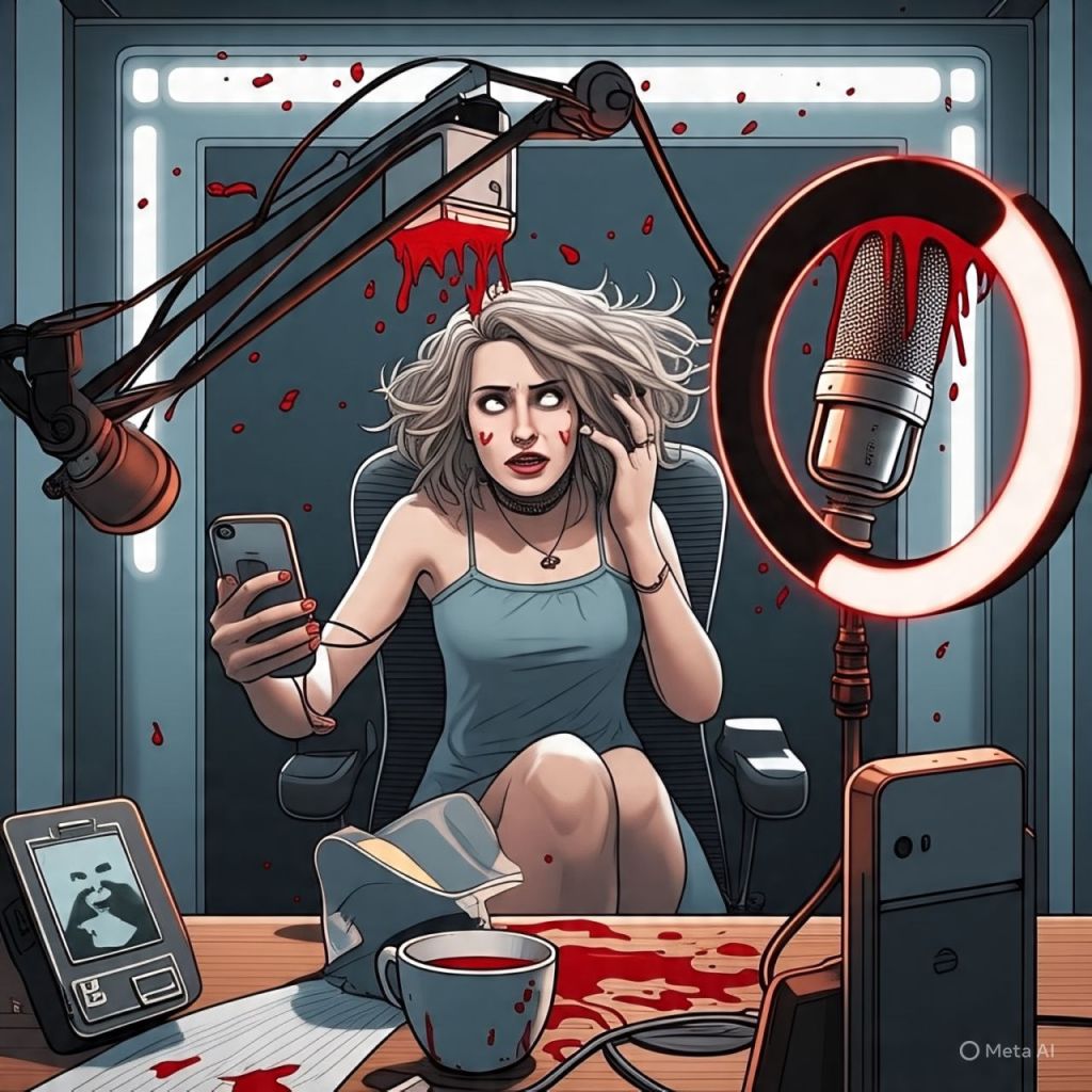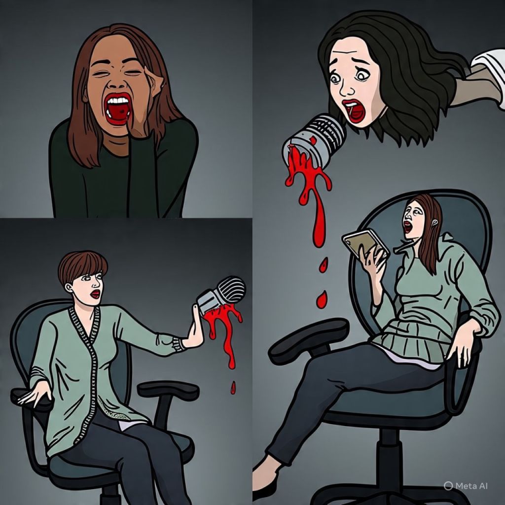 The mic melts. Blood pours from her ring light.