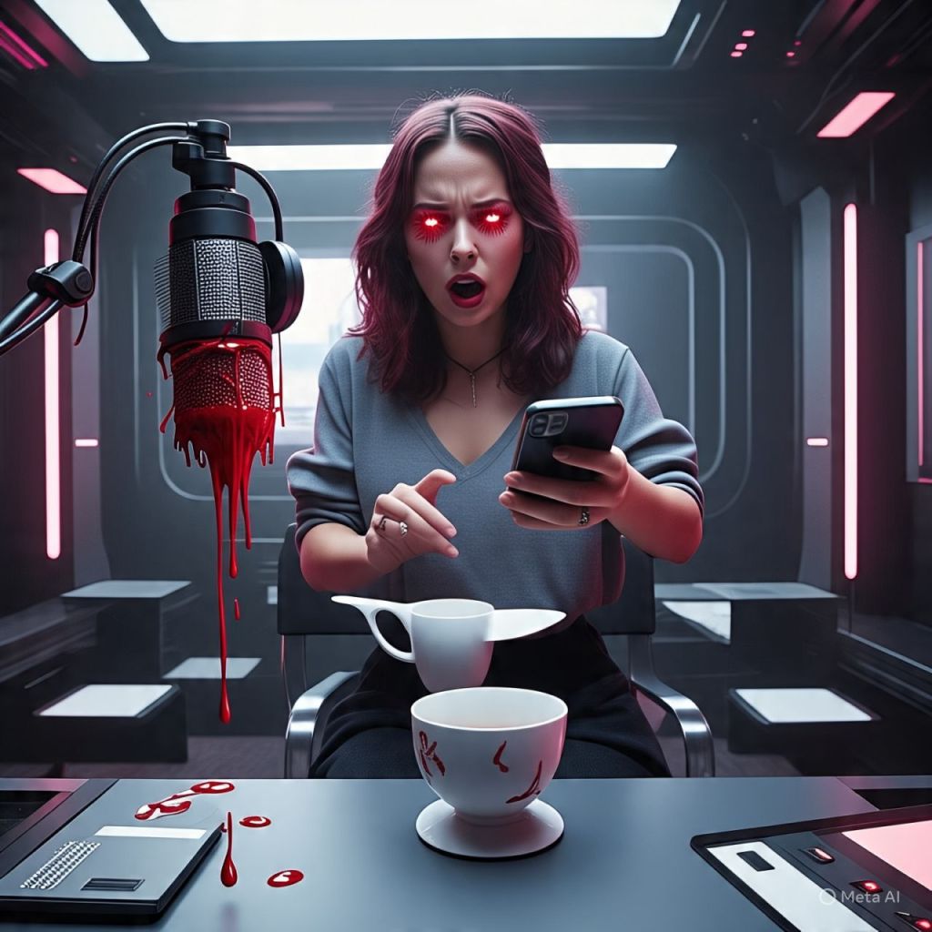Tasha is levitating above her podcast chair, still spilling tea uncontrollably.
