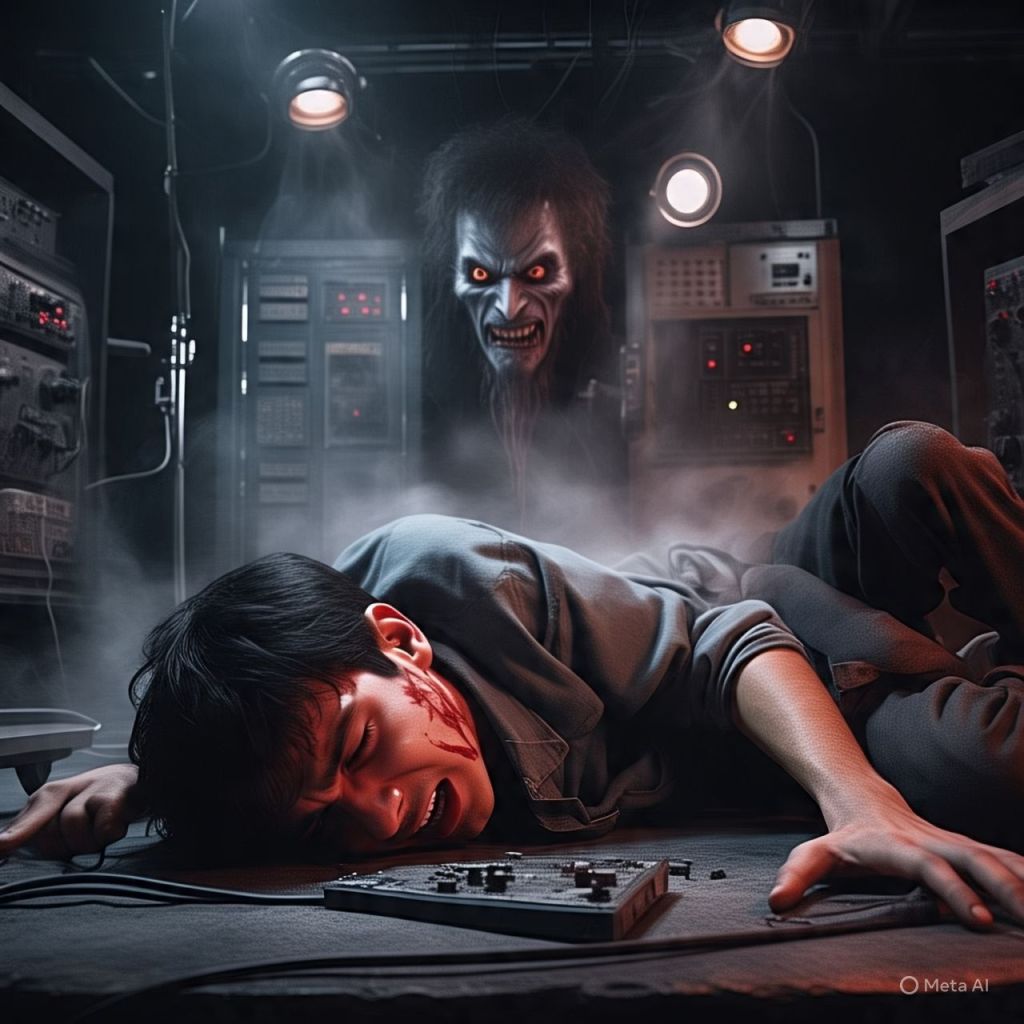 The board short-circuits. The whole studio goes black.