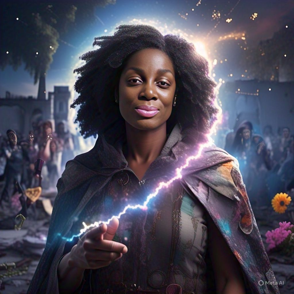 Her eyes glow. The sky splits.