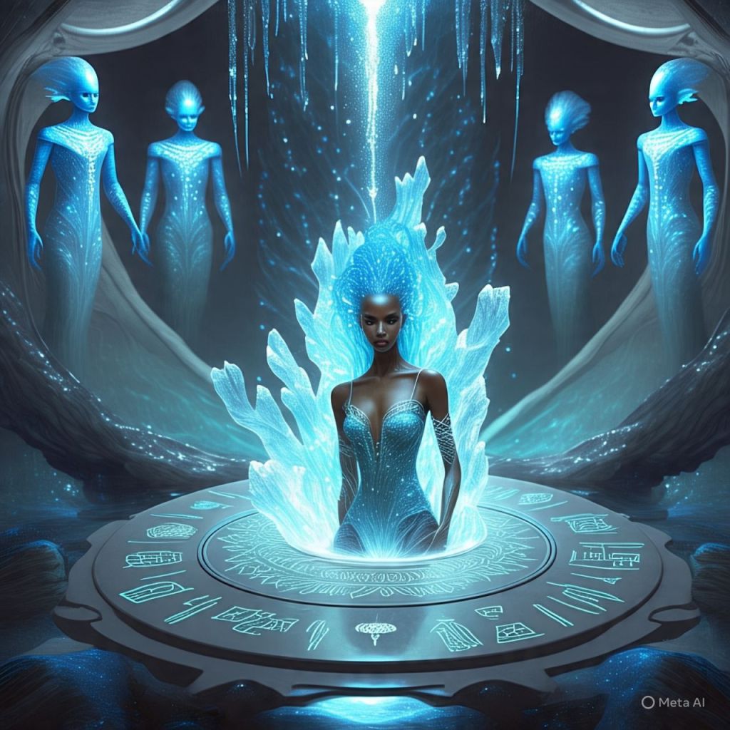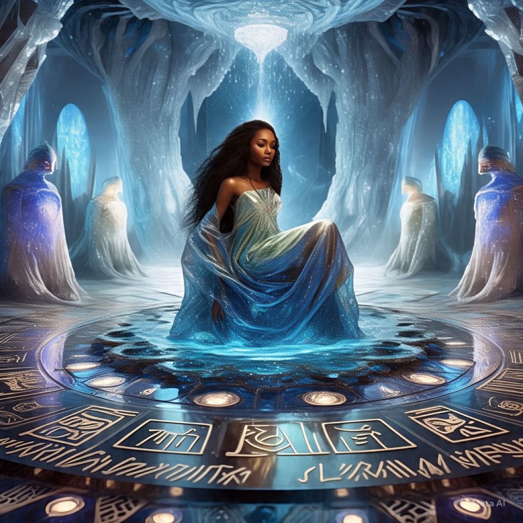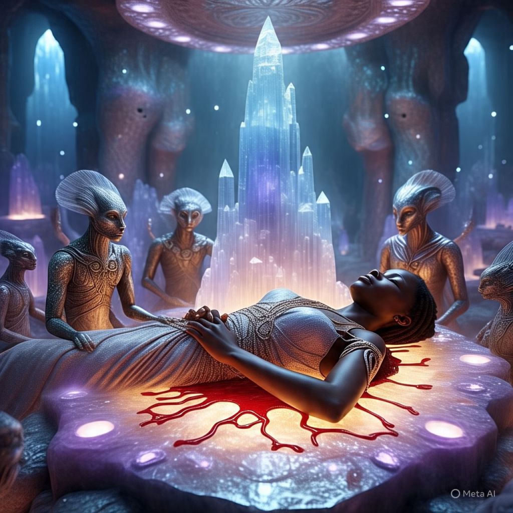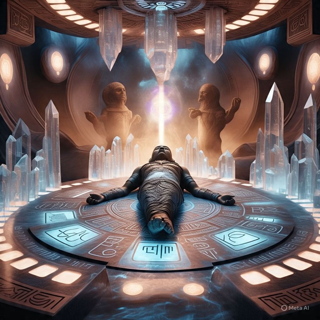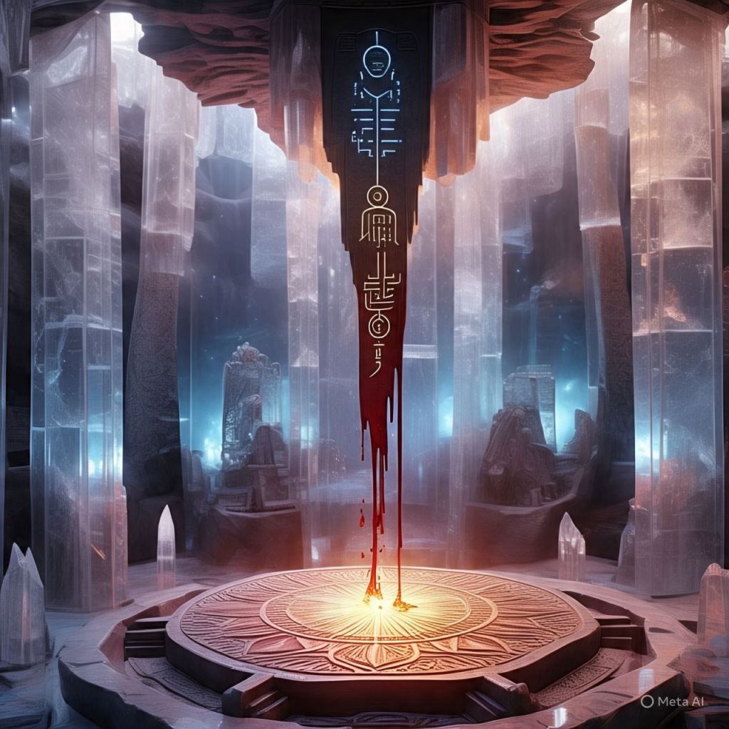 Her blood spills onto a platform that reacts like code. Symbols light up — Nubian, Atlantean, and Celestial.
