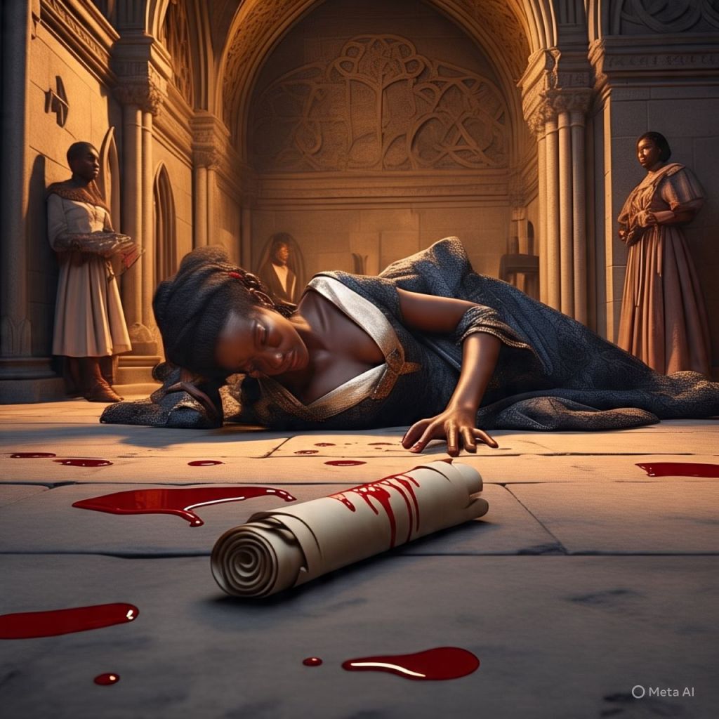 Antoinette — collapsed. Blood on the scroll. Still.
