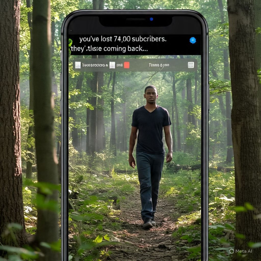 Dameon walks alone through the woods, phone in hand. No signal. His livestream UI flickers across his vision like a hallucination.