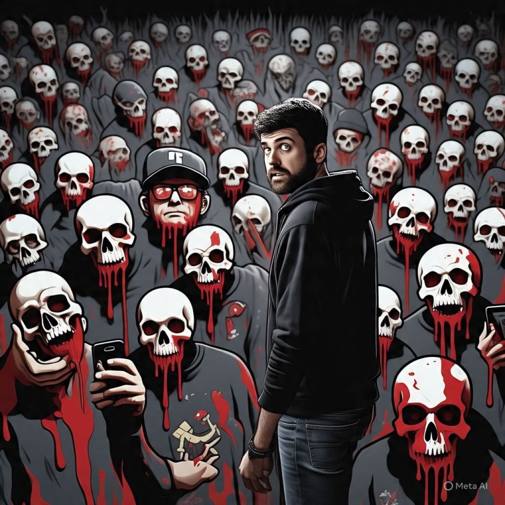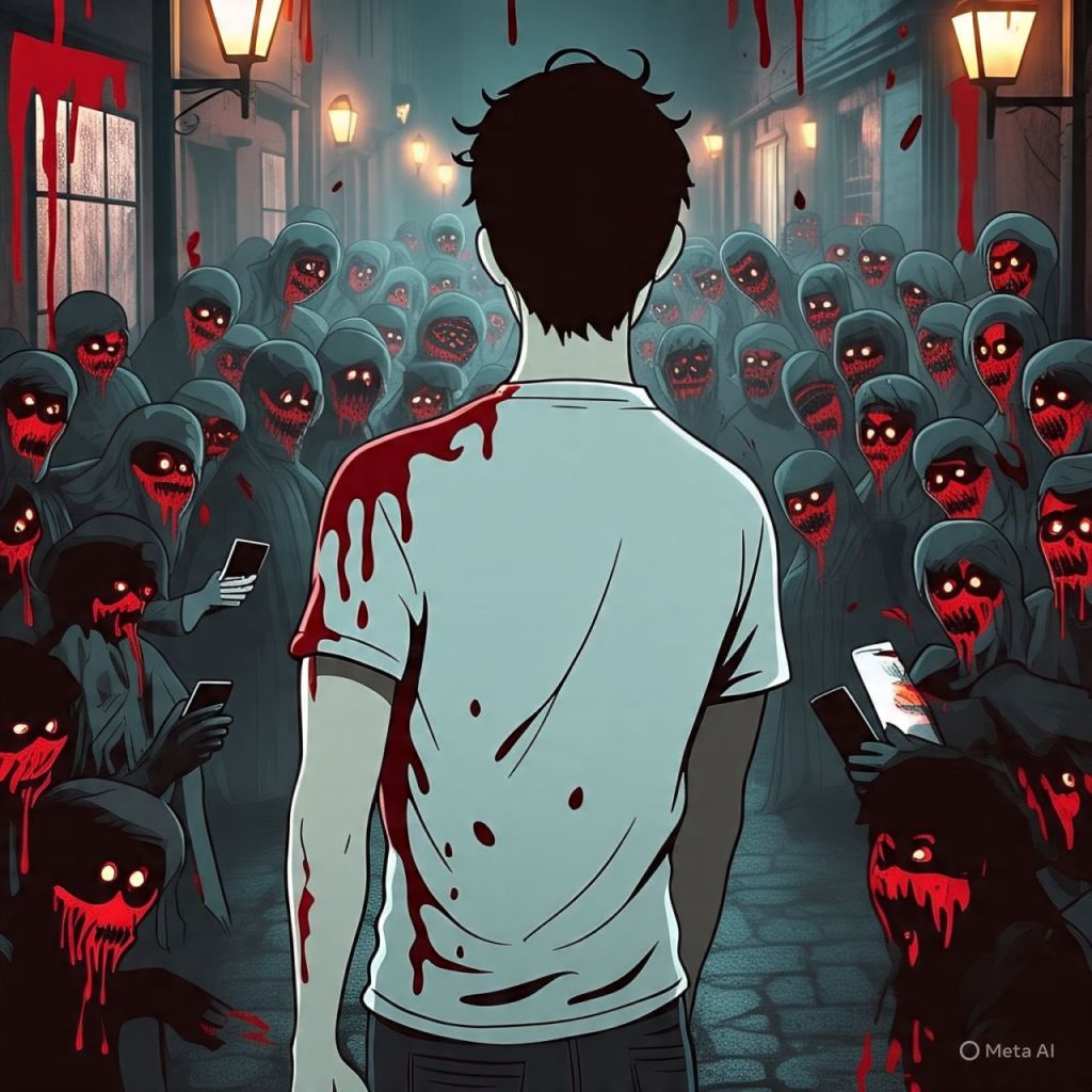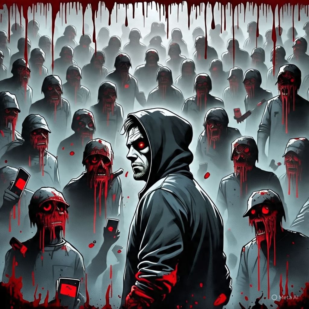 Behind him: Hundreds of blood-dripping shadow figures, faces warped into distorted follower icons.