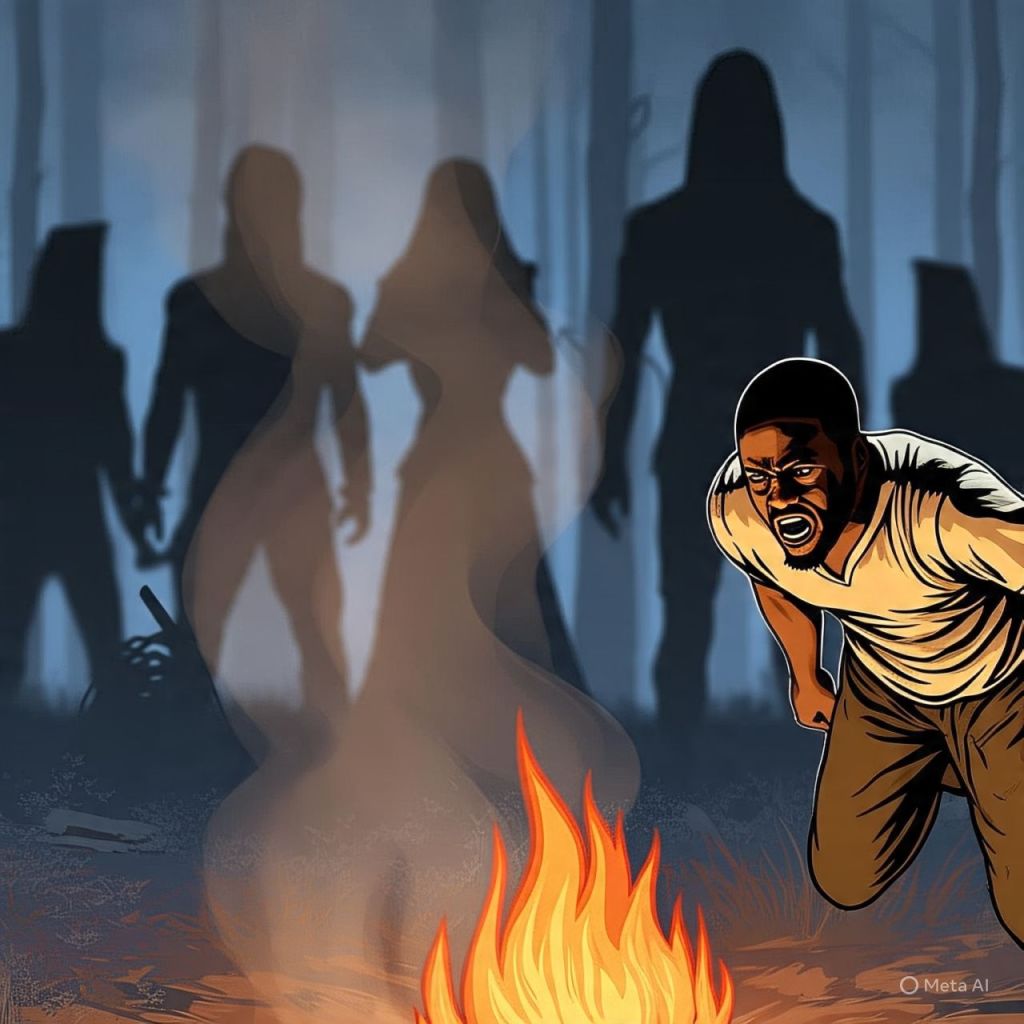 He points behind her — the shadows appear at the camp’s edge, whispering: