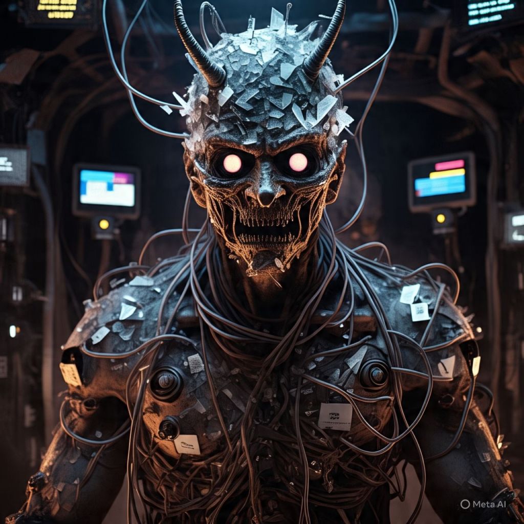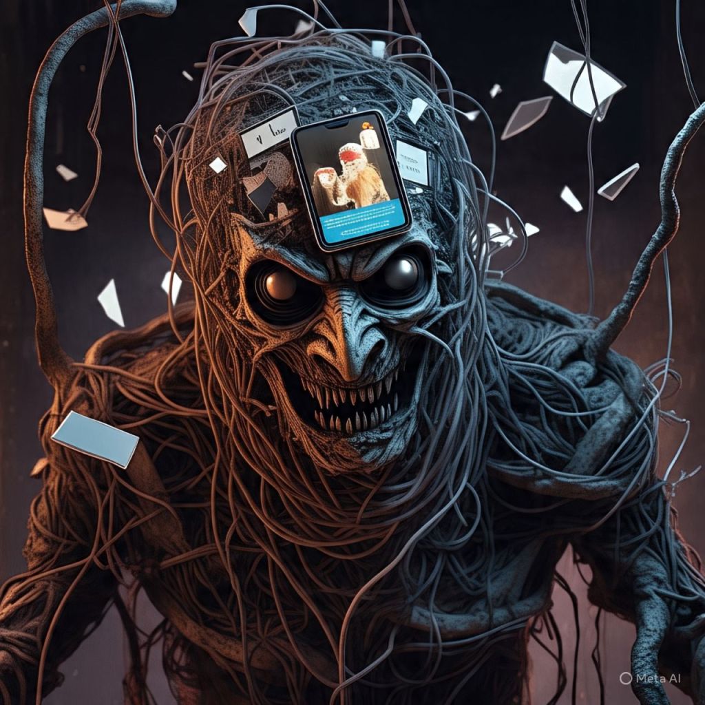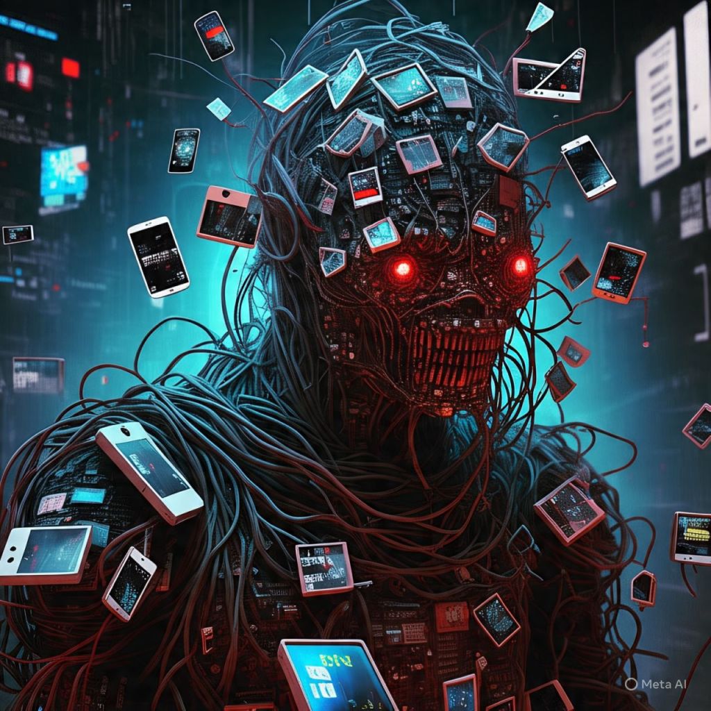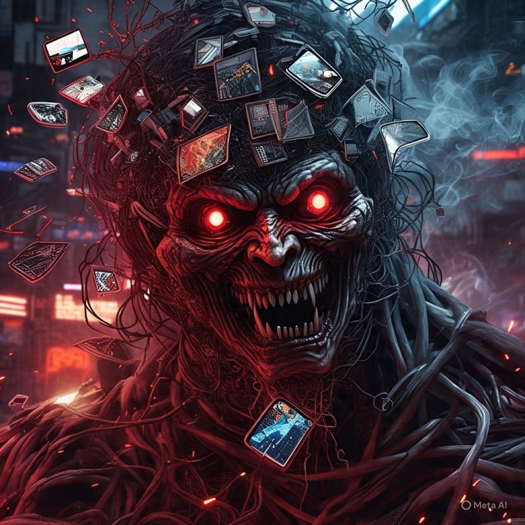 From the center rises a demonic entity made from corrupted data — wrapped in livestream wires, wearing a mask made of broken phone screens.