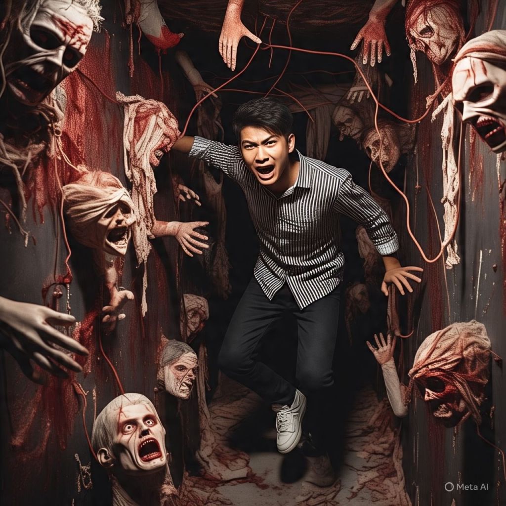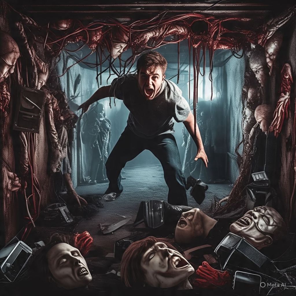 He yells, pulls free, and drops through the floor—into an abandoned influencer museum filled with twisted mannequins of the dead cast.