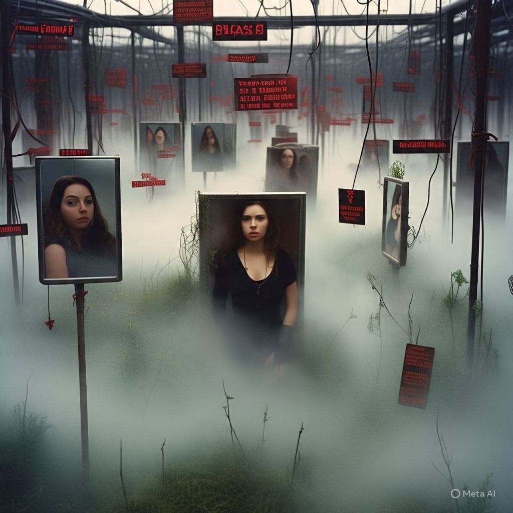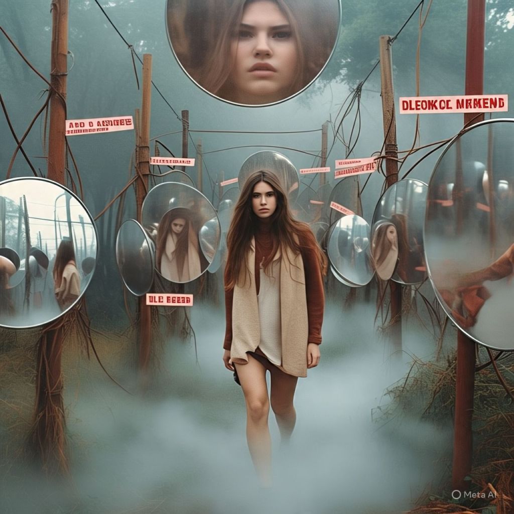 Every mirror shows a filtered version of herself — with fake captions, old lies, and blocked comments scrolling in blood.