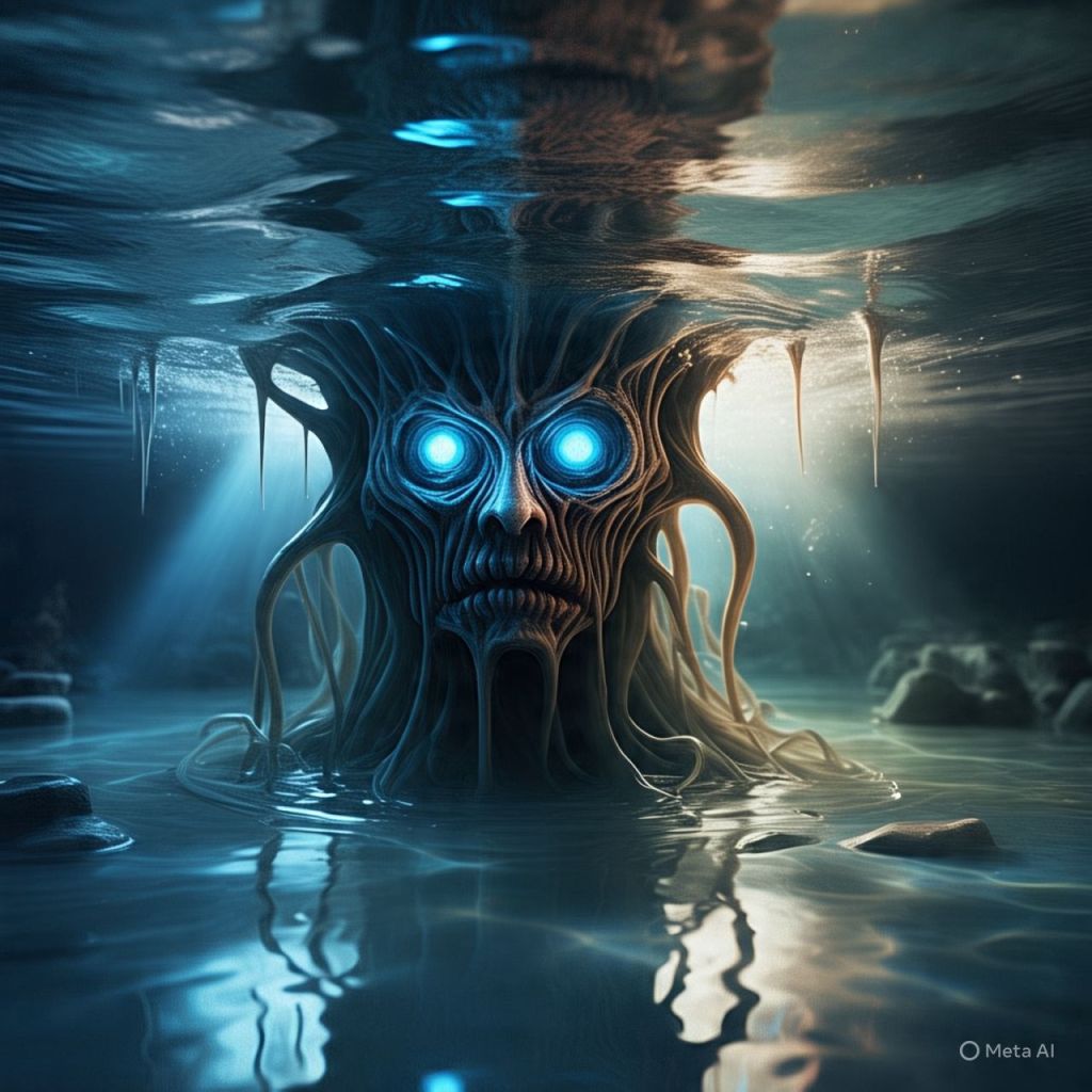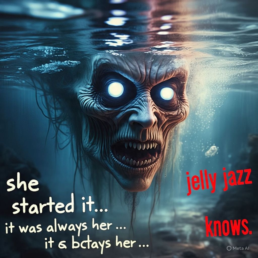 A ghostly, monstrous version of Jelly’s face opens its eyes underwater.