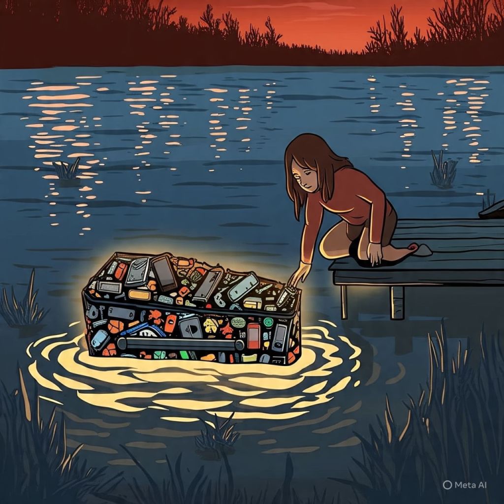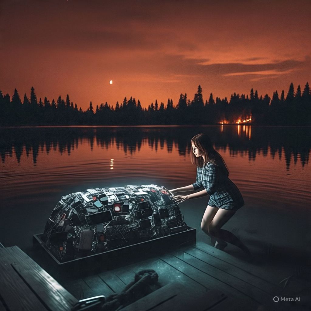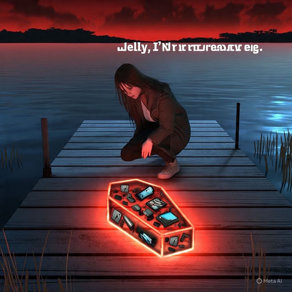 A glowing coffin made of phones, tablets, USB drives, and cursed fan DMs.
