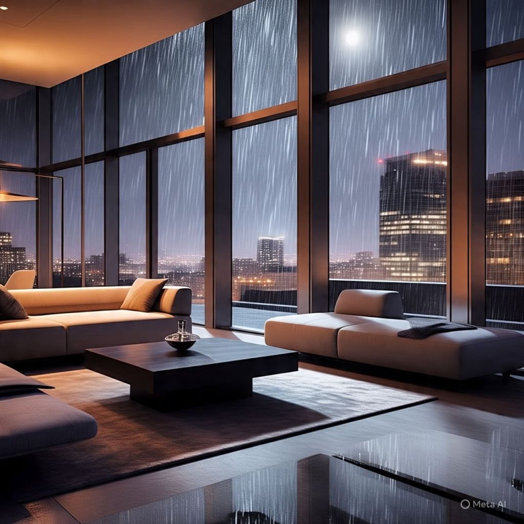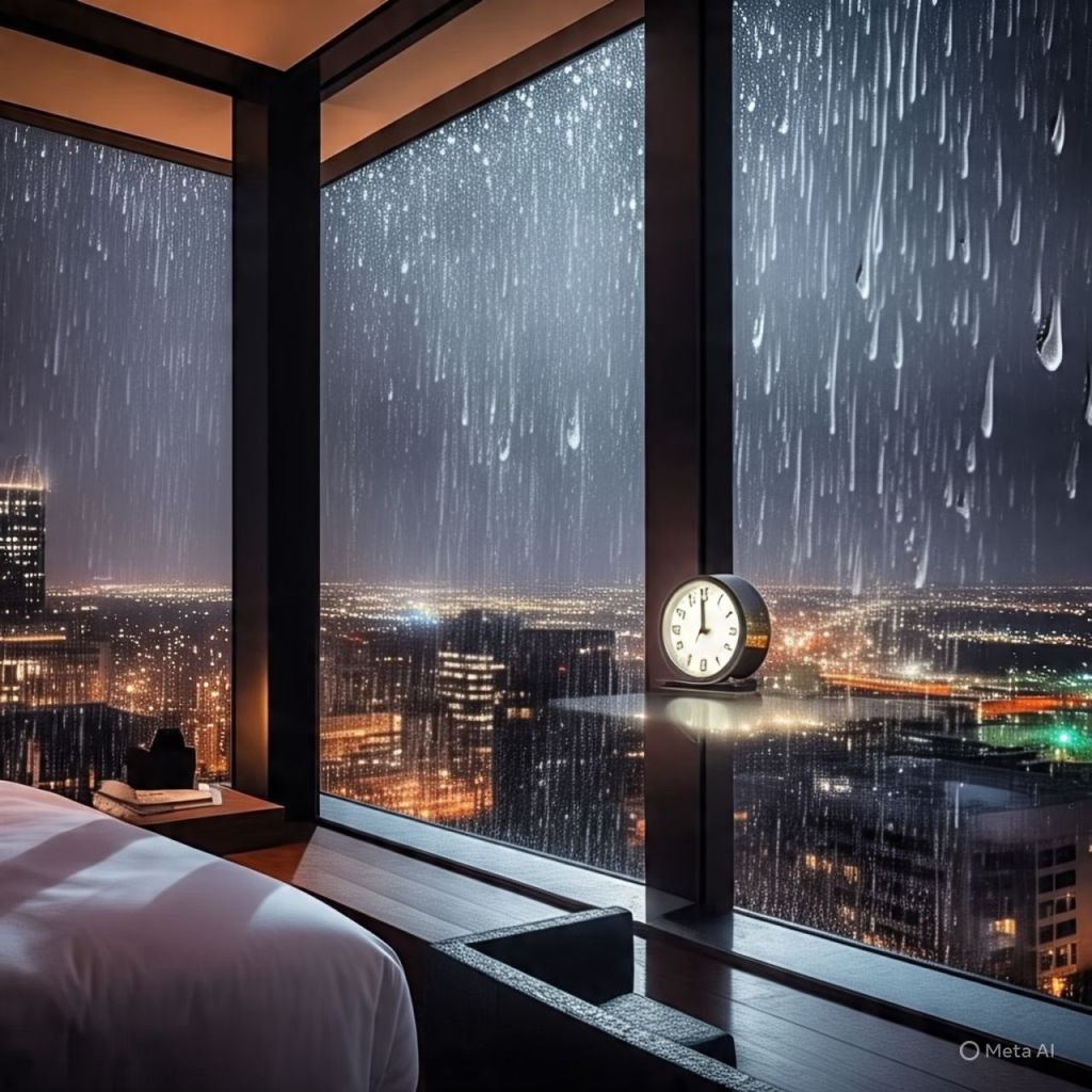 The rain is tapping against the glass walls of the retreat’s luxury penthouse.