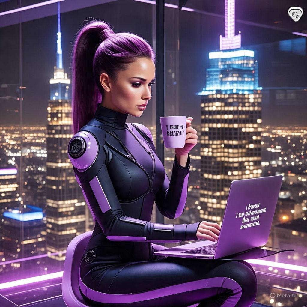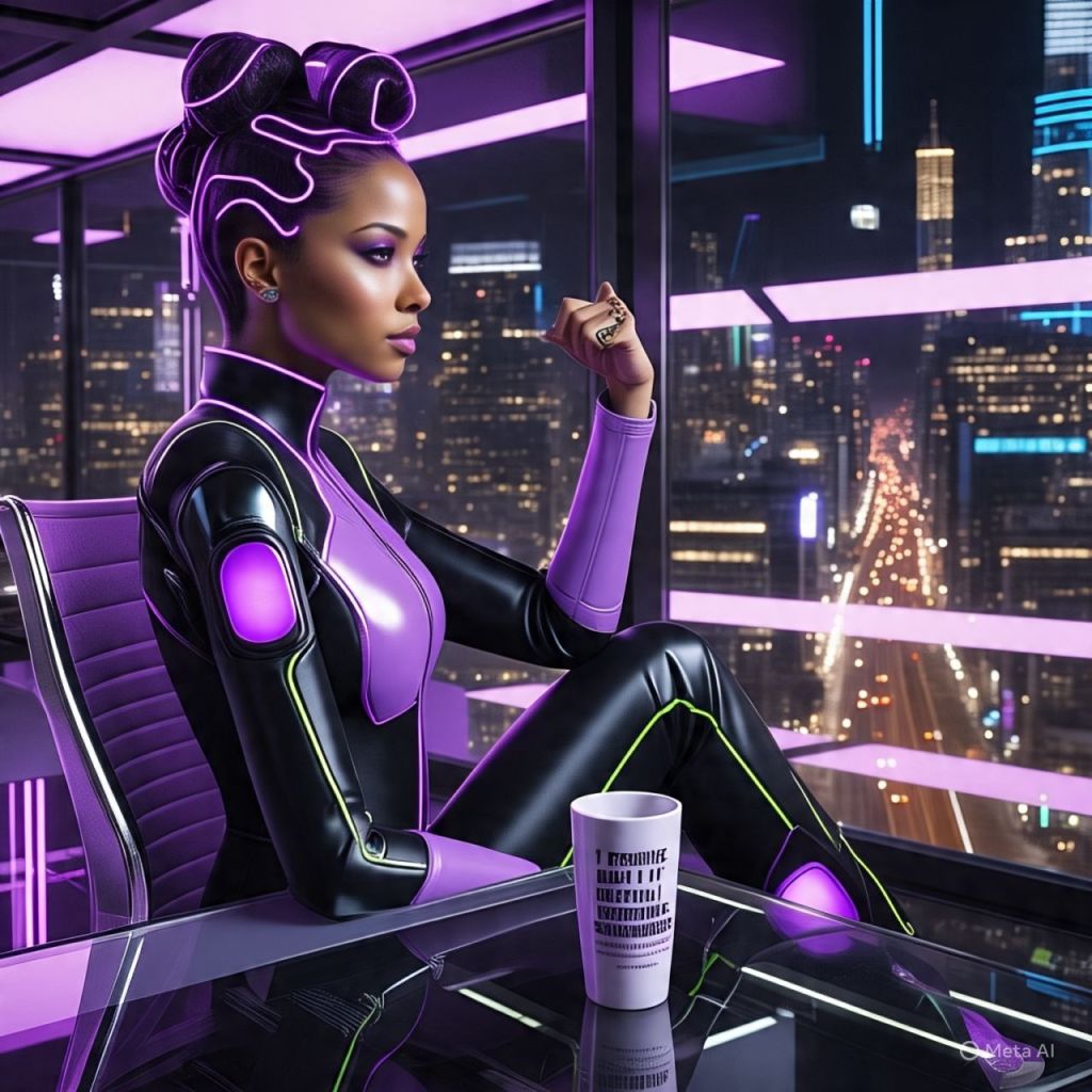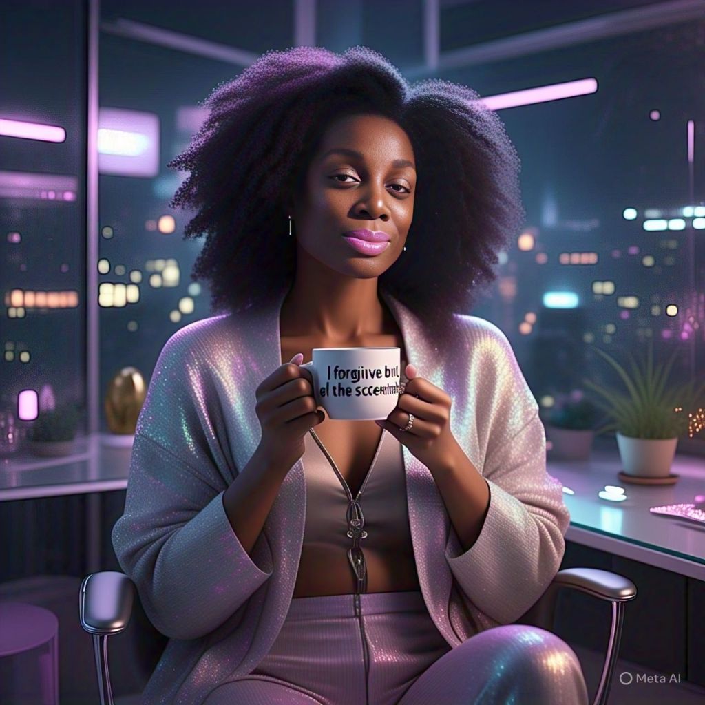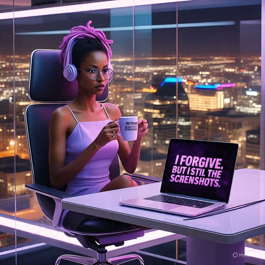 [Scene: Ms. Reality in a futuristic glass office, overlooking the city at night. LED lights glowing lavender. She’s sipping tea from a cup that says “I Forgive, But I Still Got the Screenshots.”]