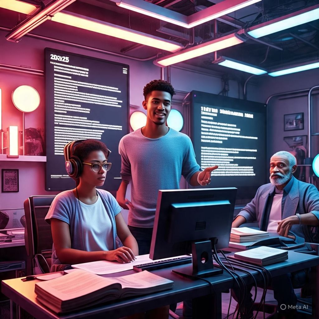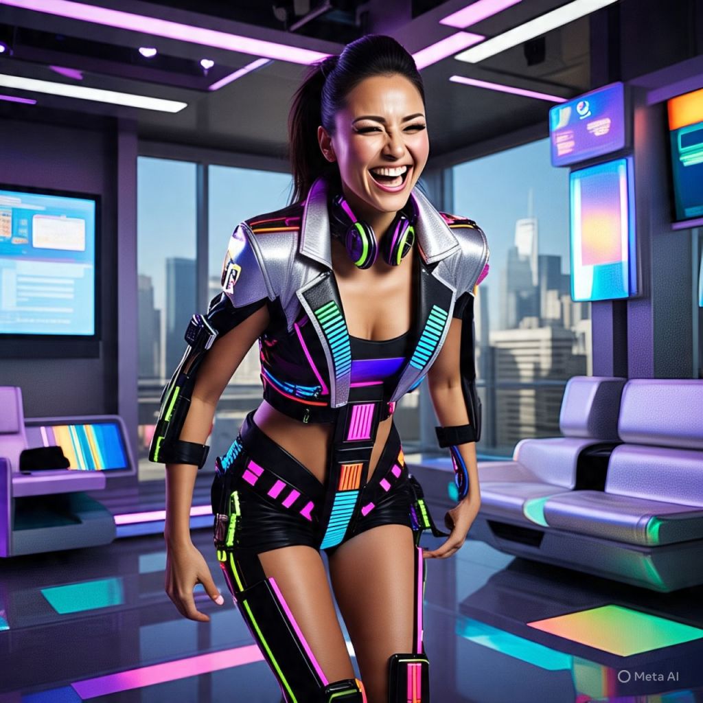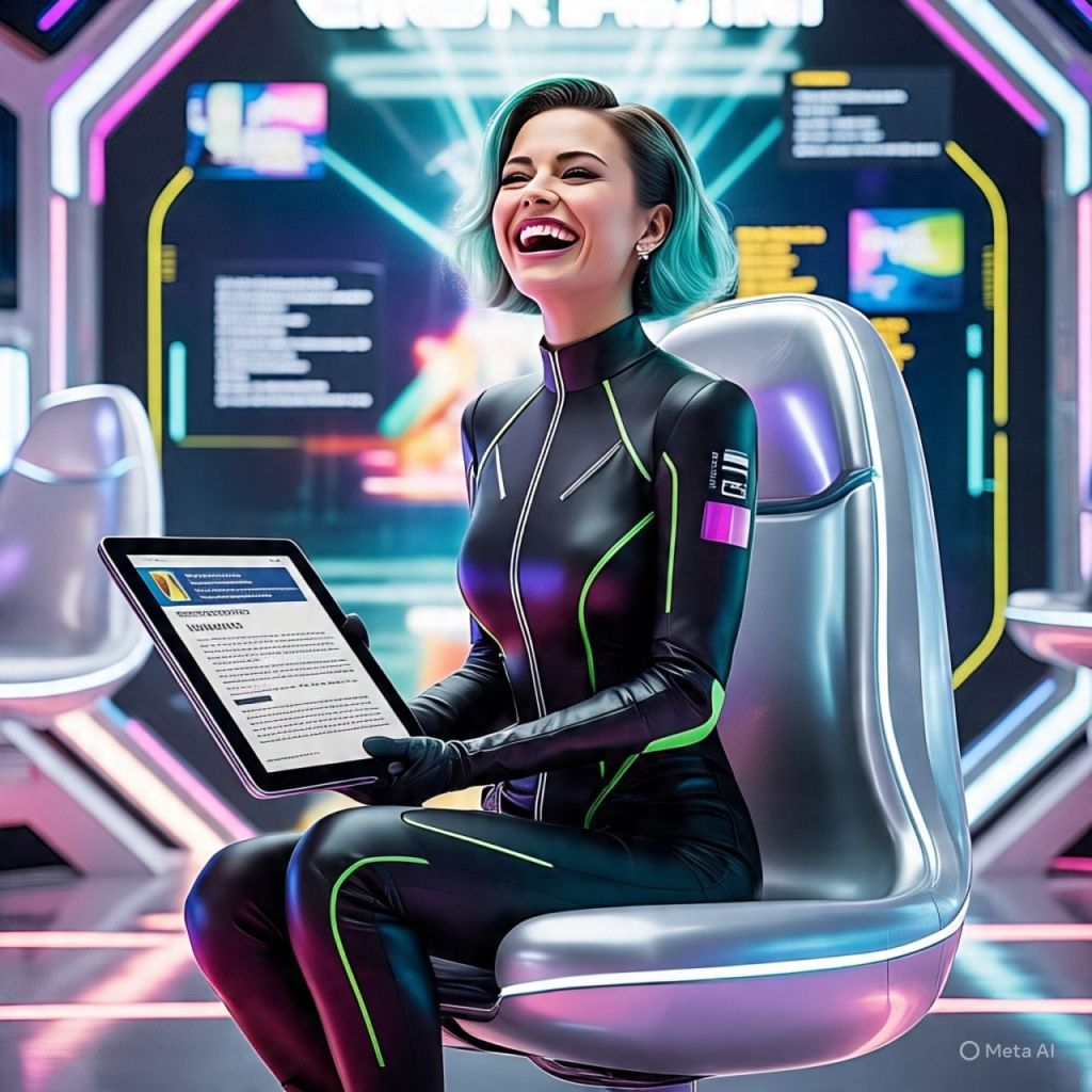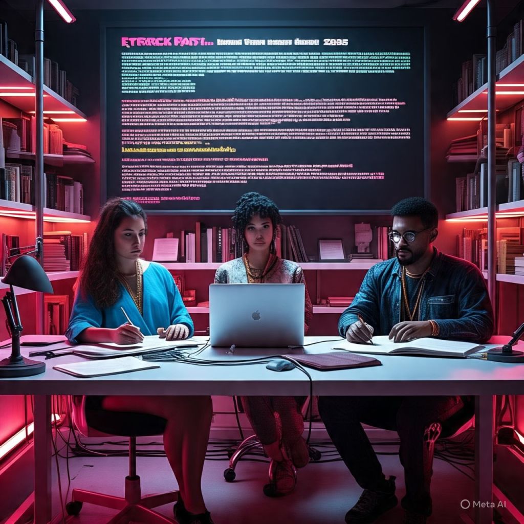 [Scene: Neon-lit writer’s room. Characters: Ms. Reality, FutureFlex, and Psychic Papi. A giant screen shows headlines from 2028—already written in 2025 by them.]