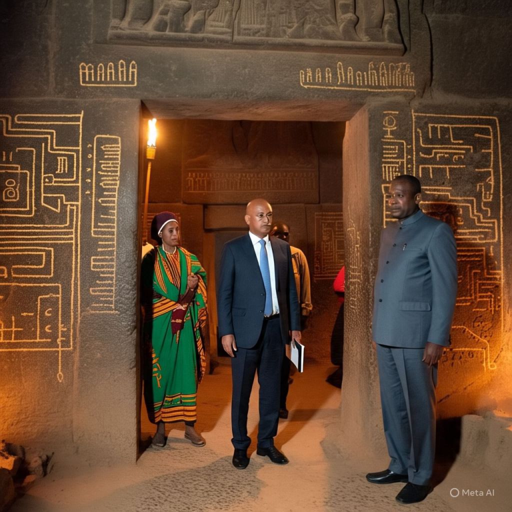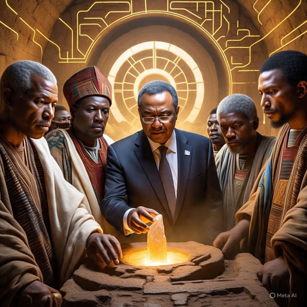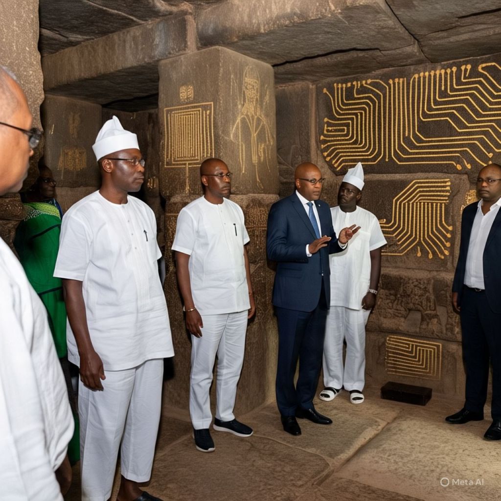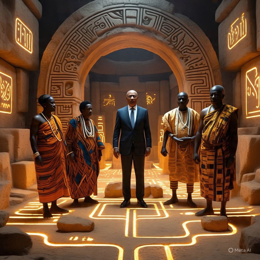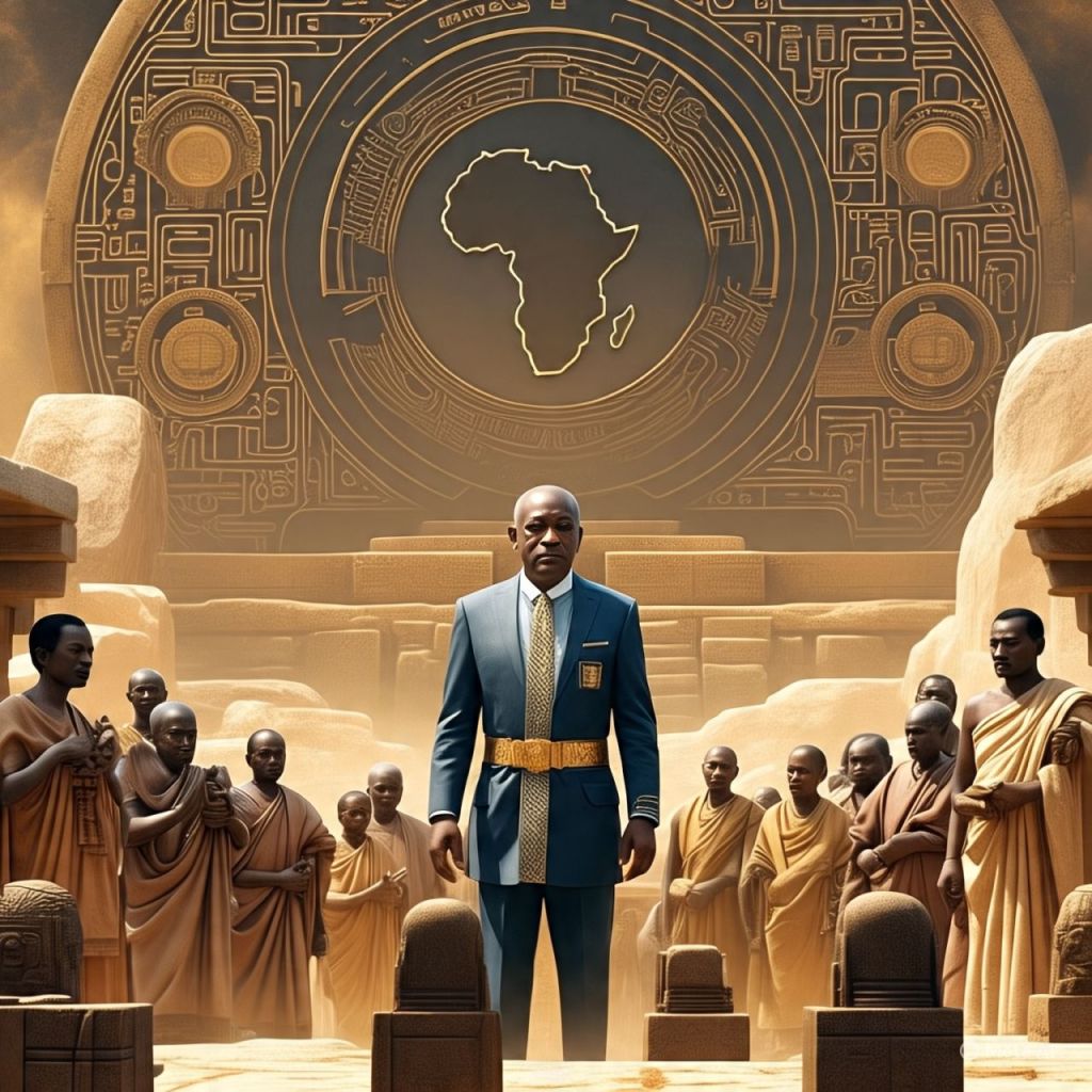 He stands with leaders from across Africa in a newly unearthed ancient temple covered in golden circuitry etched into stone.