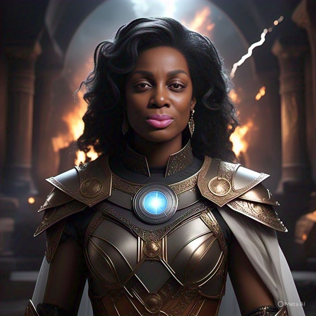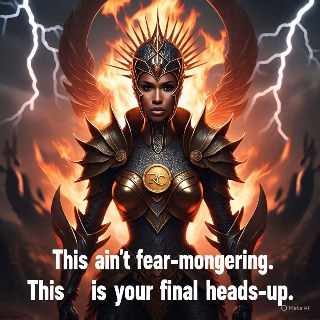 ️ Ms. Reality appears on screen — in full queen armor, RC Coin glowing, with fire behind her and thunder above.