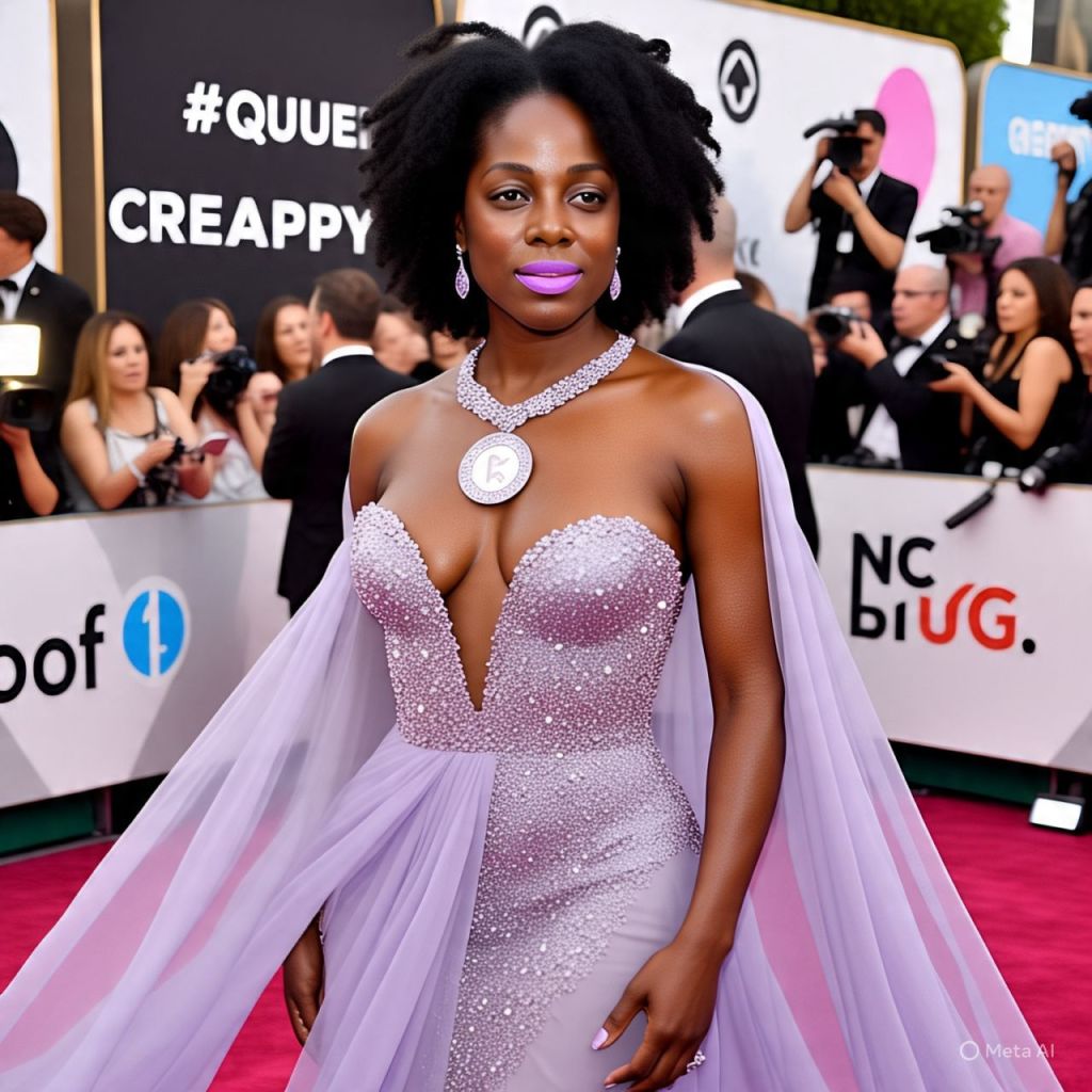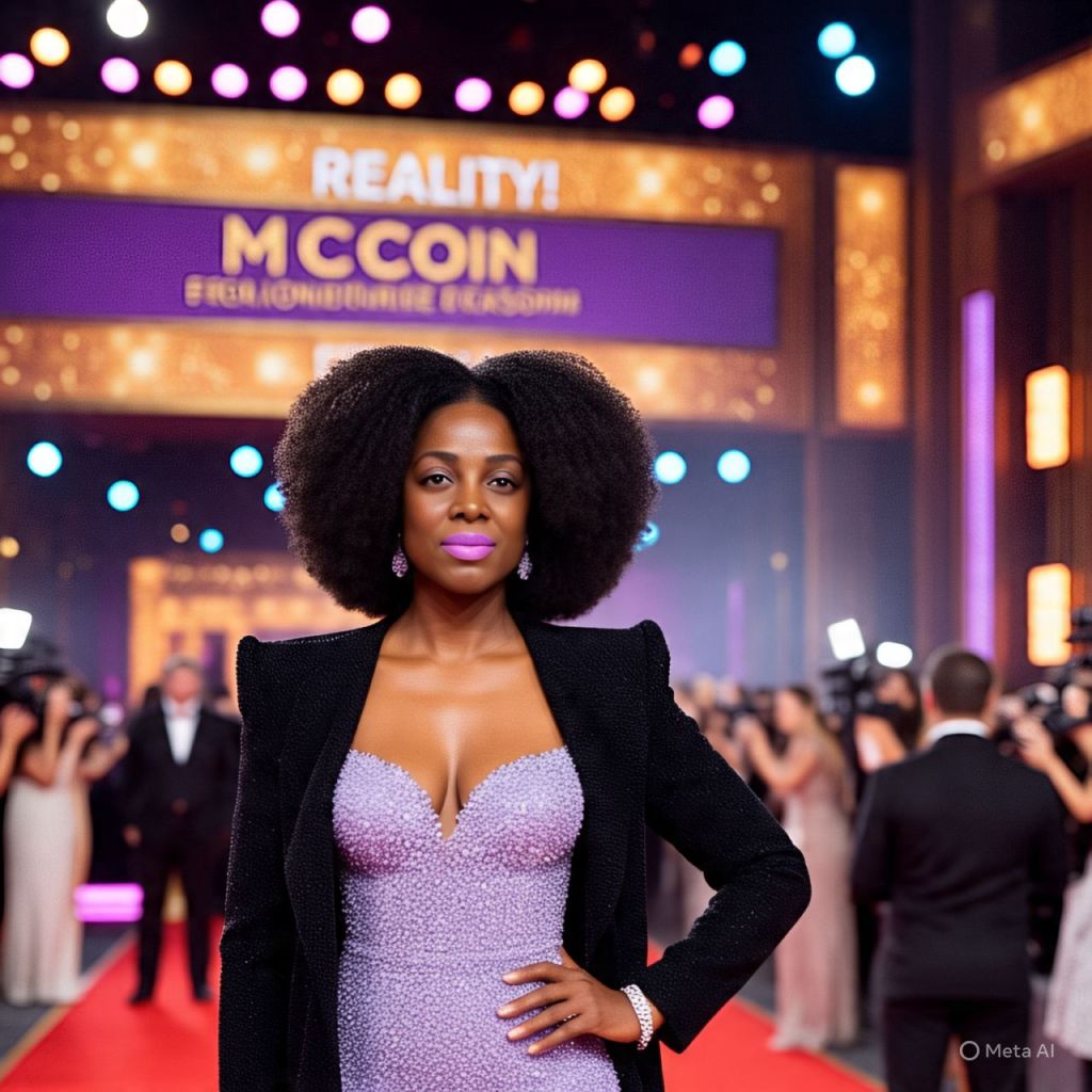 Ms. Reality is glowing on the red carpet in a custom lavender crystal dress with the RCCOIN logo sparkling across her chest. Paparazzi flashes everywhere. Reporters everywhere screaming: