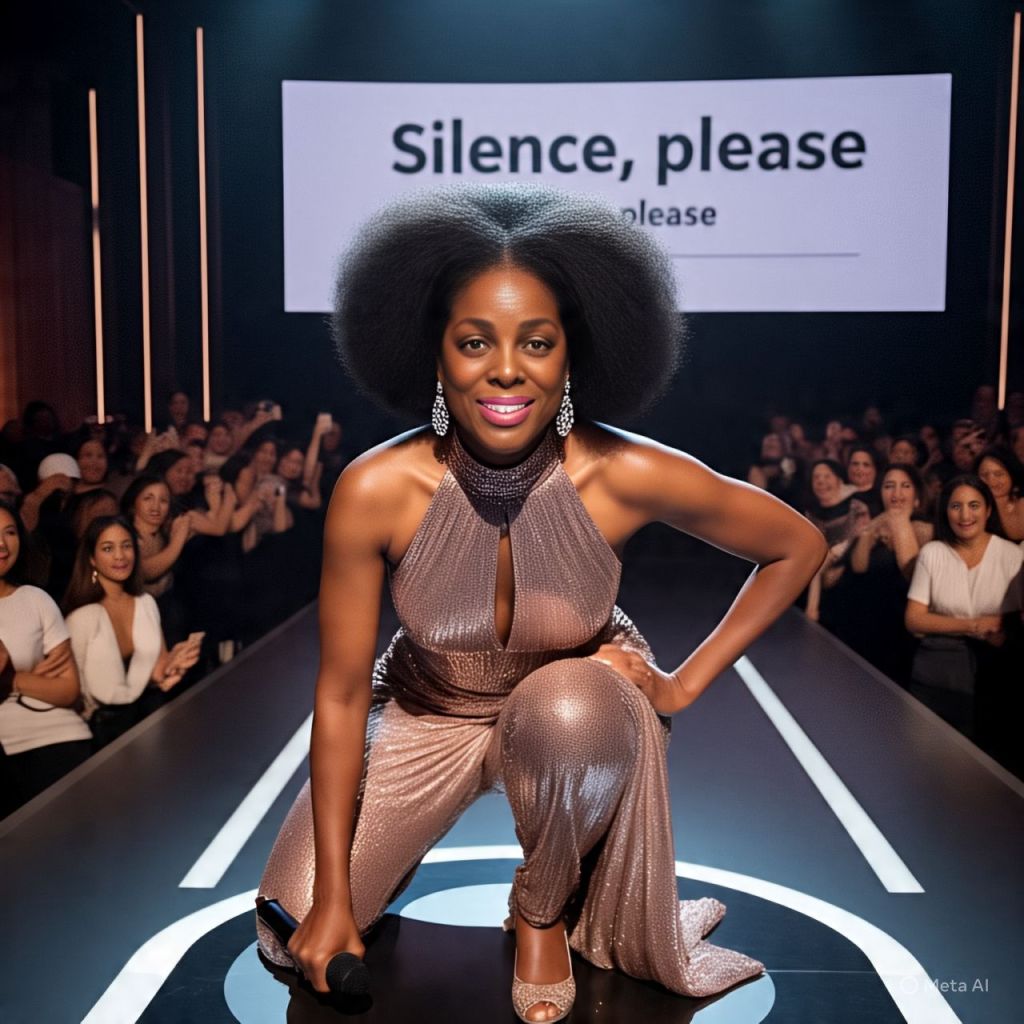 Ms. Reality opens her show with the most iconic entrance of the season—descending on a platform shaped like a mute button while the crowd chants “SHHH!”