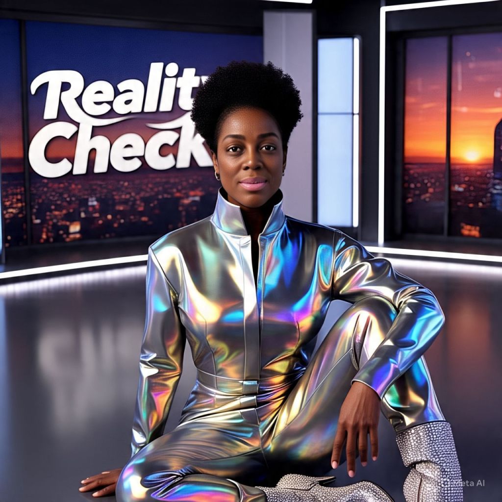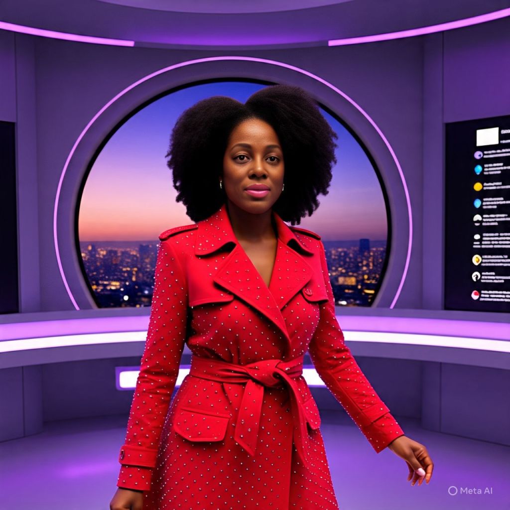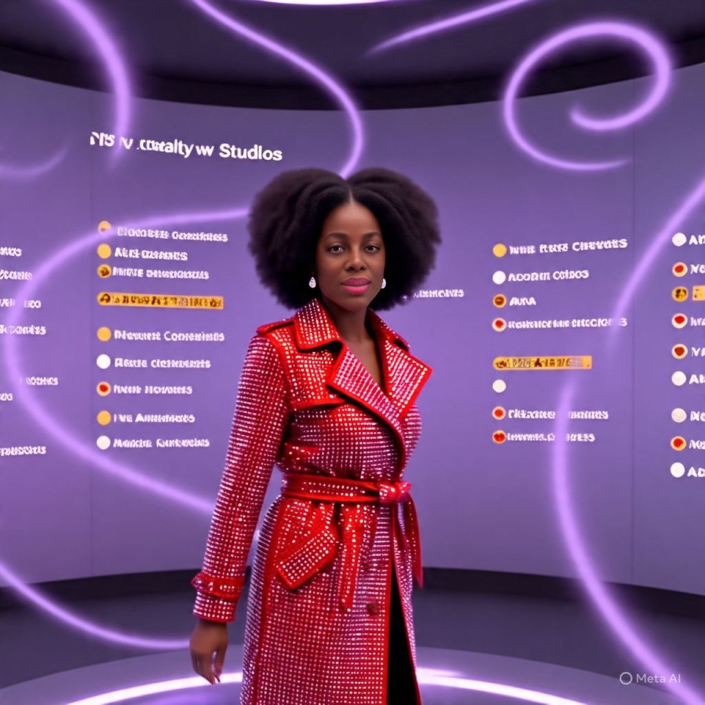 Lavender lights swirl as Ms. Reality steps out in a red diamond-studded trench coat with gold heels, entering her Tokyo-based studio now streaming in over 130 countries. The walls pulse with energy — each panel displaying live viewer comments in real time from Brazil, Ghana, Paris, Atlanta, and Jamaica.
