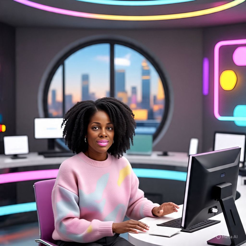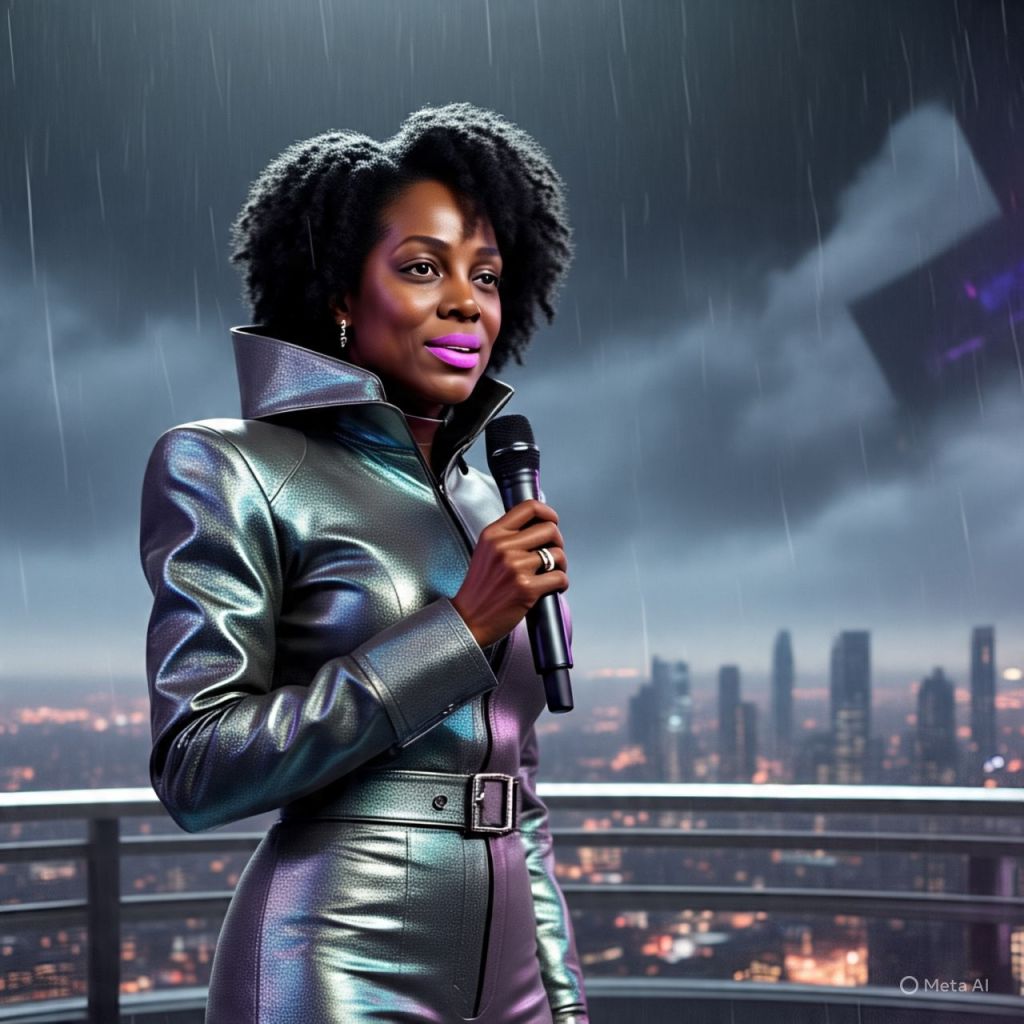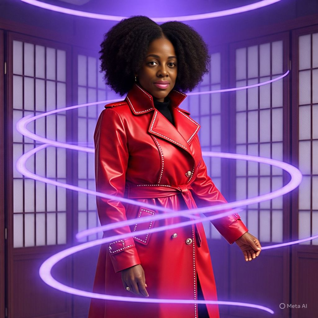 Lavender lights swirl as Ms. Reality steps out in a red diamond-studded trench coat with gold heels, entering her Tokyo-based studio now streaming in over 130 countries. The walls pulse with energy — each panel displaying live viewer comments in real time from Brazil, Ghana, Paris, Atlanta, and Jamaica.