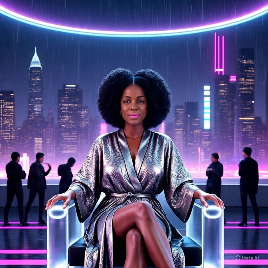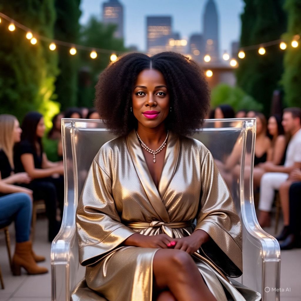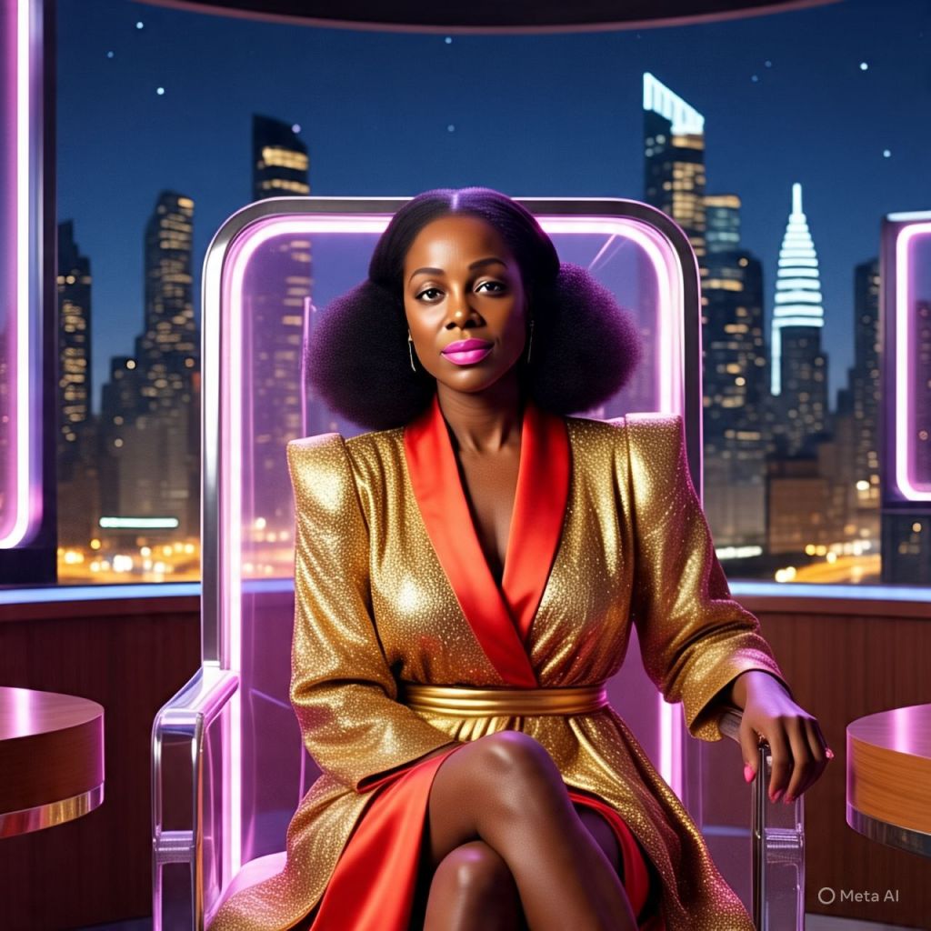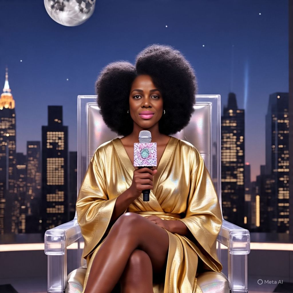 The skyline glows behind Ms. Reality. She’s seated in a see-through throne chair wearing a golden robe, red heels, and a mic hotter than a lie detector in a room full of influencers.