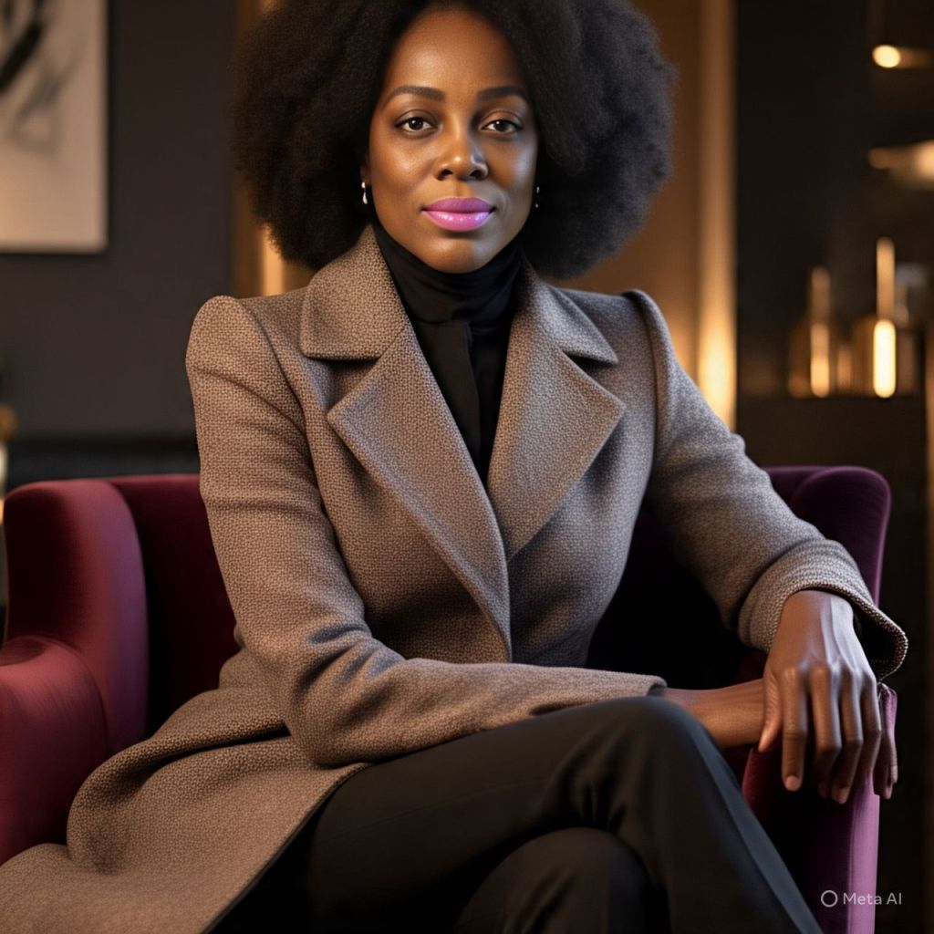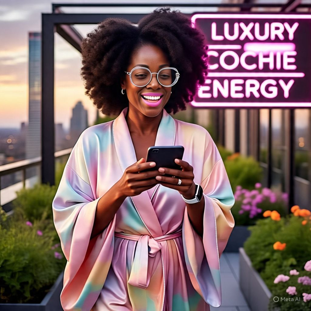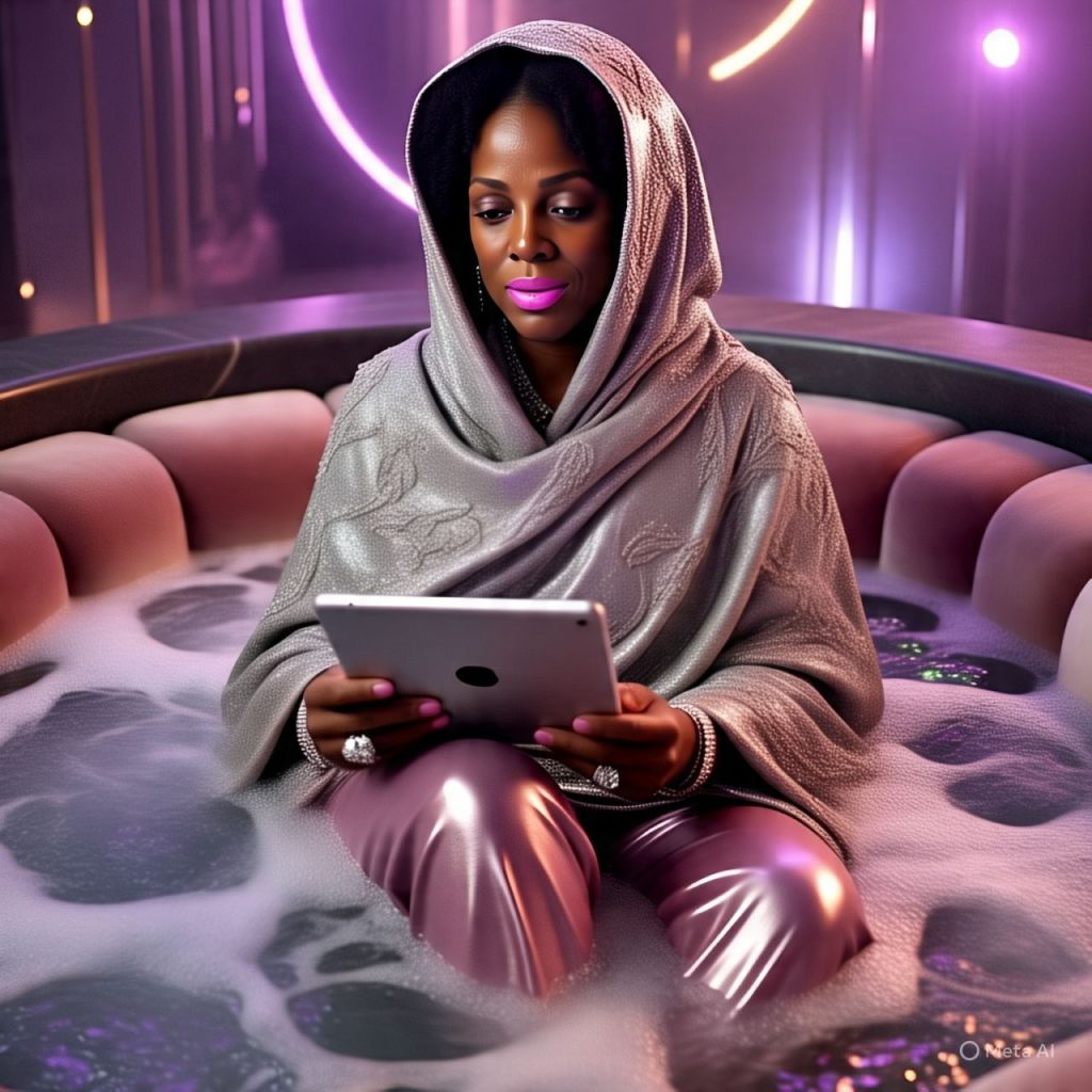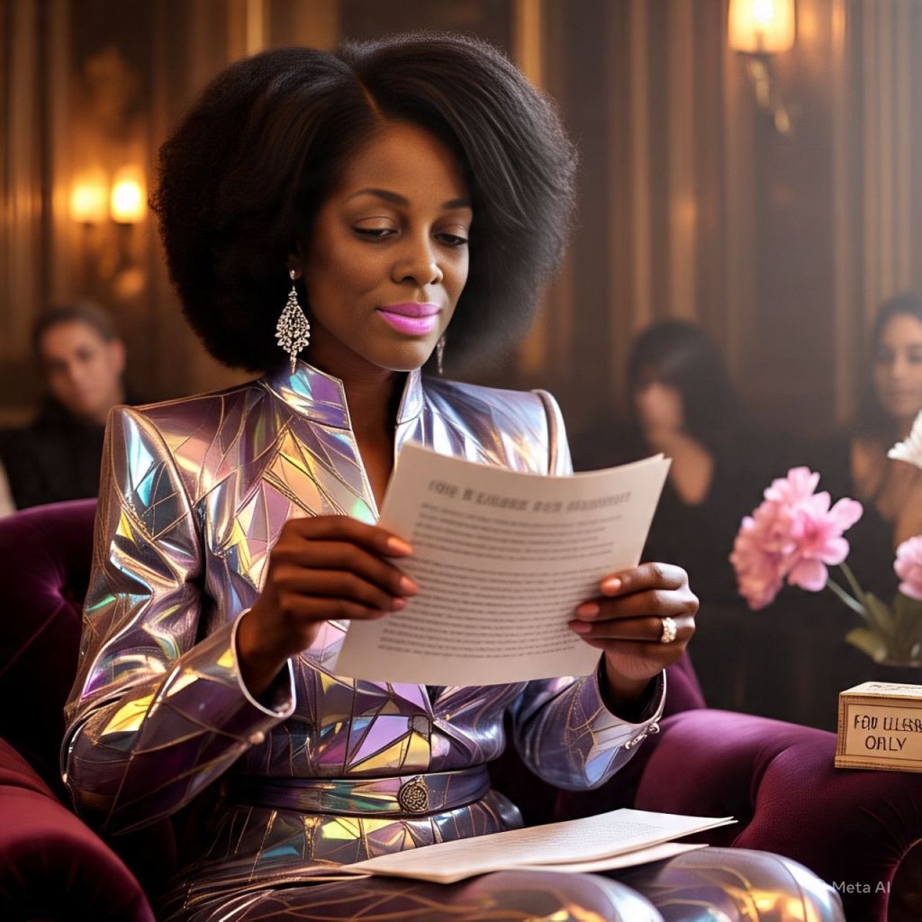 The skyline glows behind Ms. Reality. She’s seated in a see-through throne chair wearing a golden robe, red heels, and a mic hotter than a lie detector in a room full of influencers.