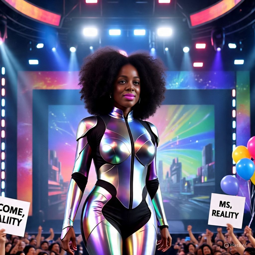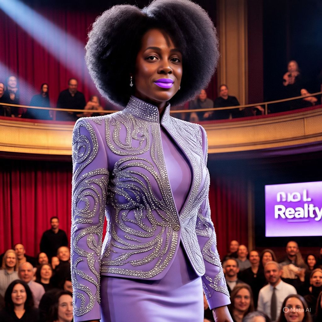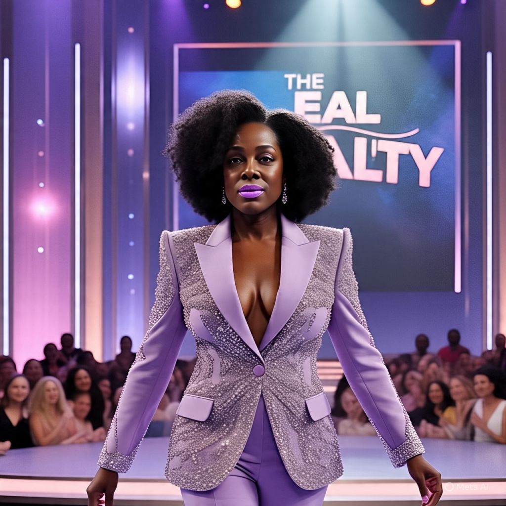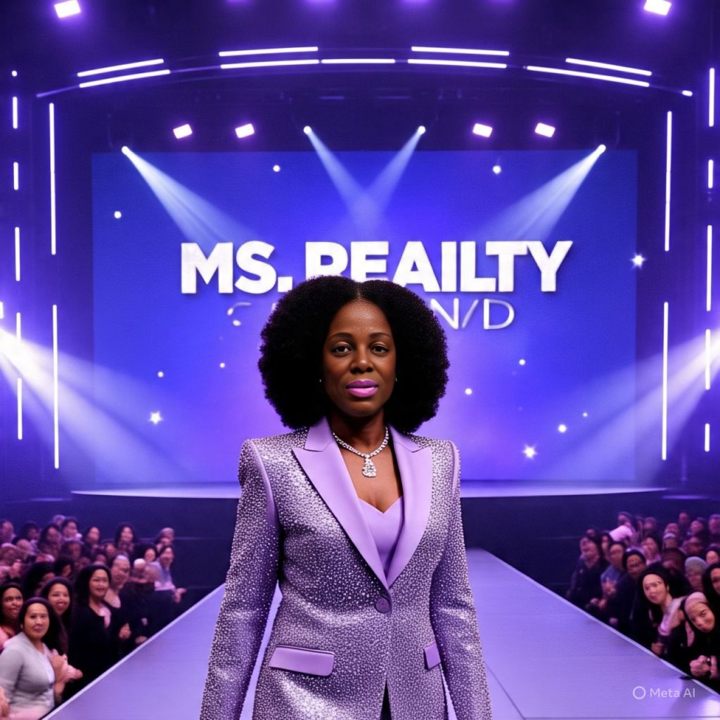 MS. REALITY walks onto the stage of a packed theater where her live season finale is being filmed. She’s in a diamond-encrusted suit with lavender heels. The crowd erupts.