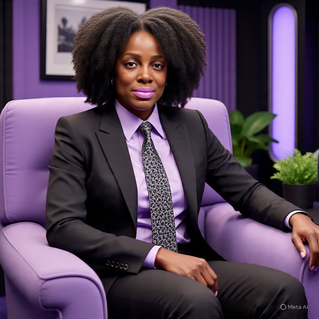 The Oouu After Dark studio is transformed into a dramatic black-and-lavender courtroom-vibe lie detector lounge.