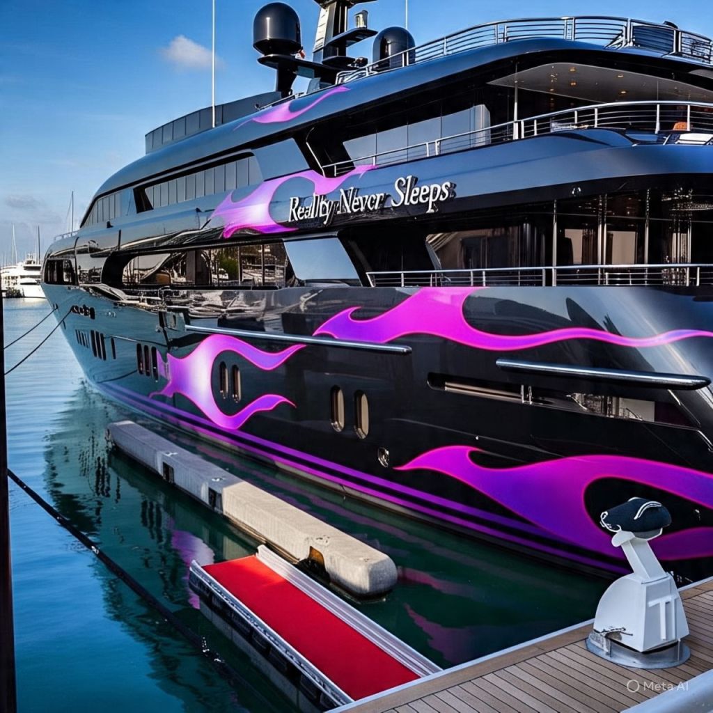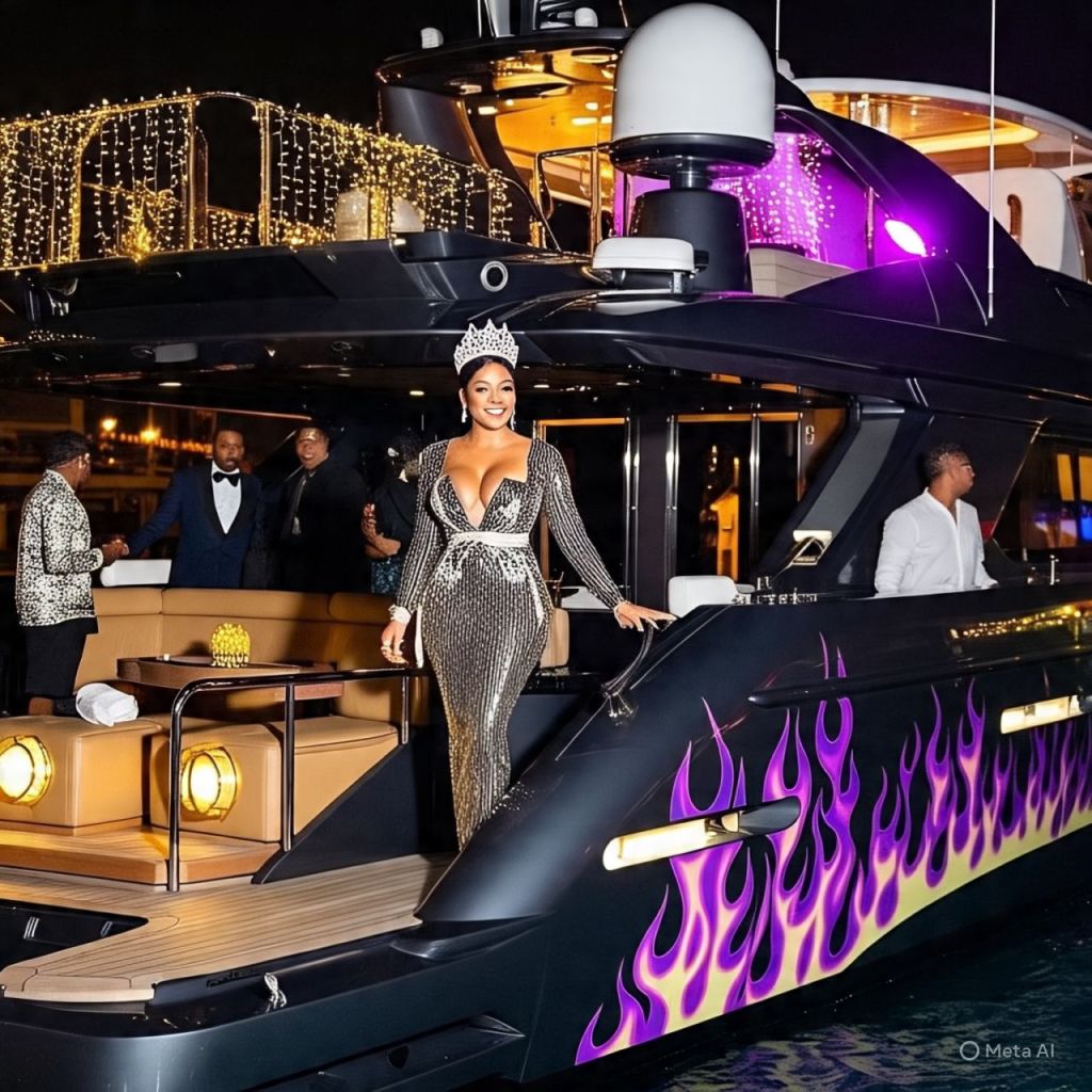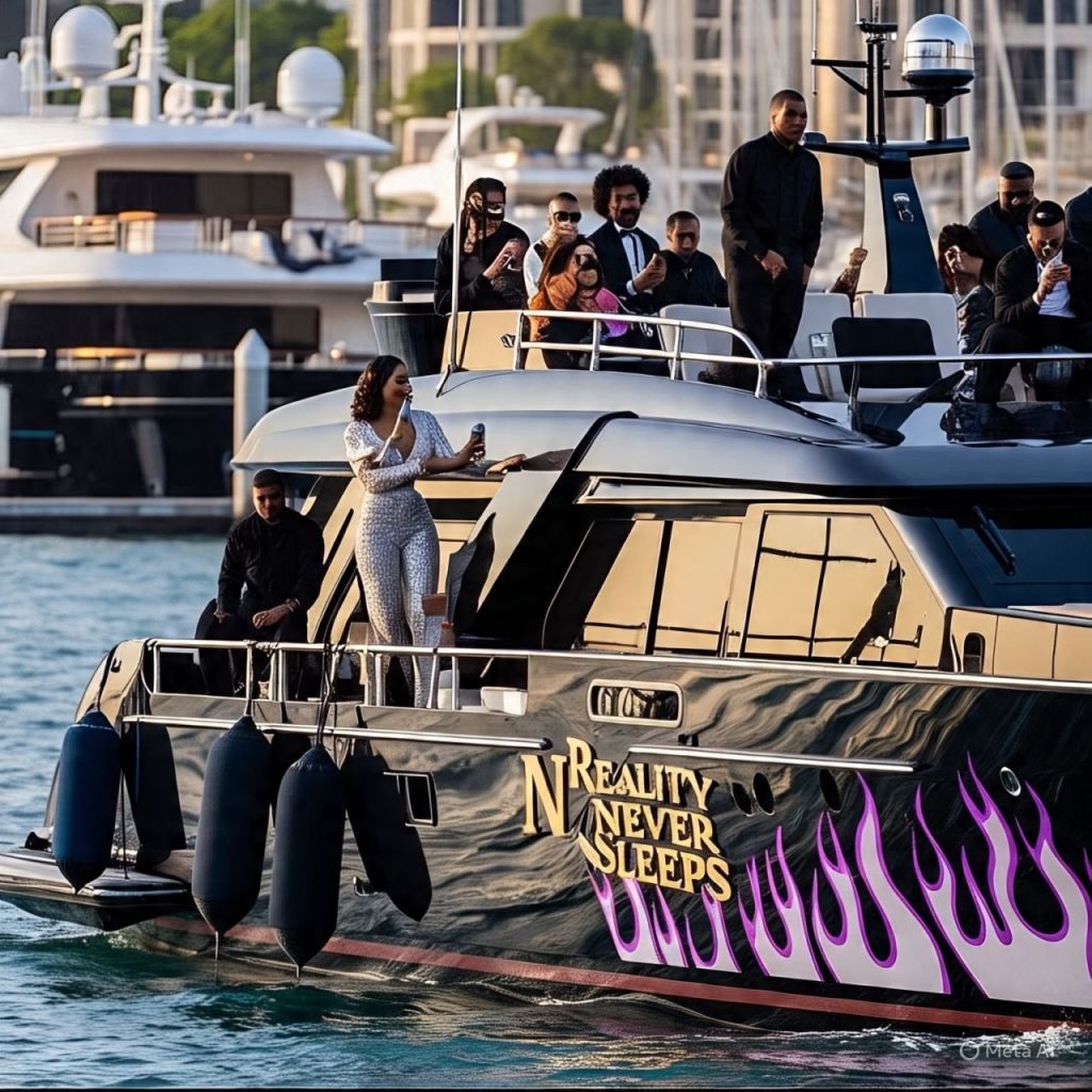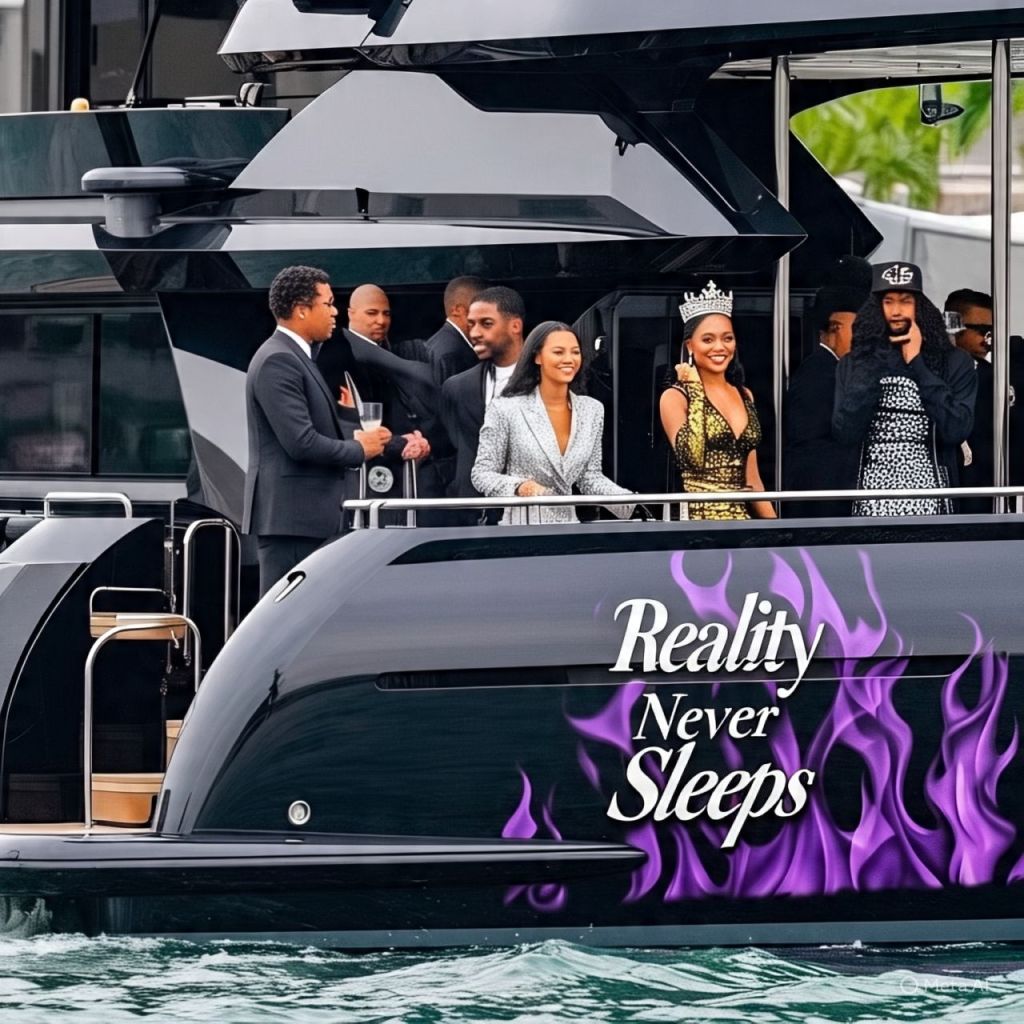 A yacht pulls up — jet black with purple flames. It’s the “REALITY NEVER SLEEPS” party hosted by Queen Reality herself. A-list guests pour in: