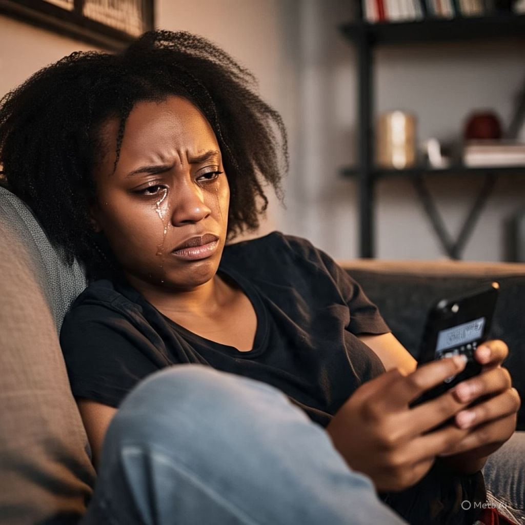 People in black scroll on their phones while crying emojis float above their heads like halos.