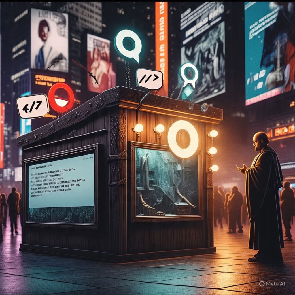 A shrine in Times Square glows — made from ring lights, comment bubbles, and “likes” nailed to wood like sacred relics.