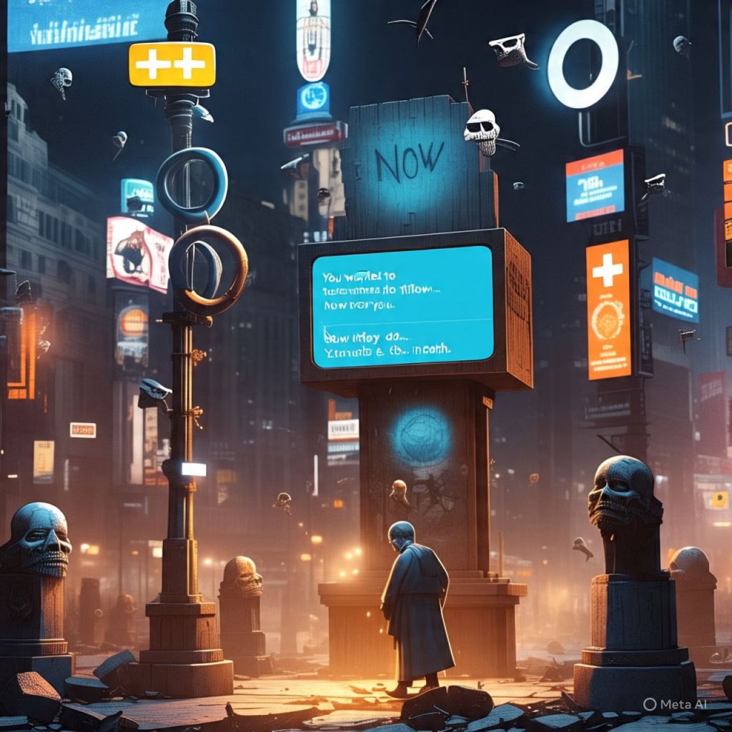 An abandoned influencer mansion — ring lights broken, TikTok logos faded, old phones scattered like tombstones.