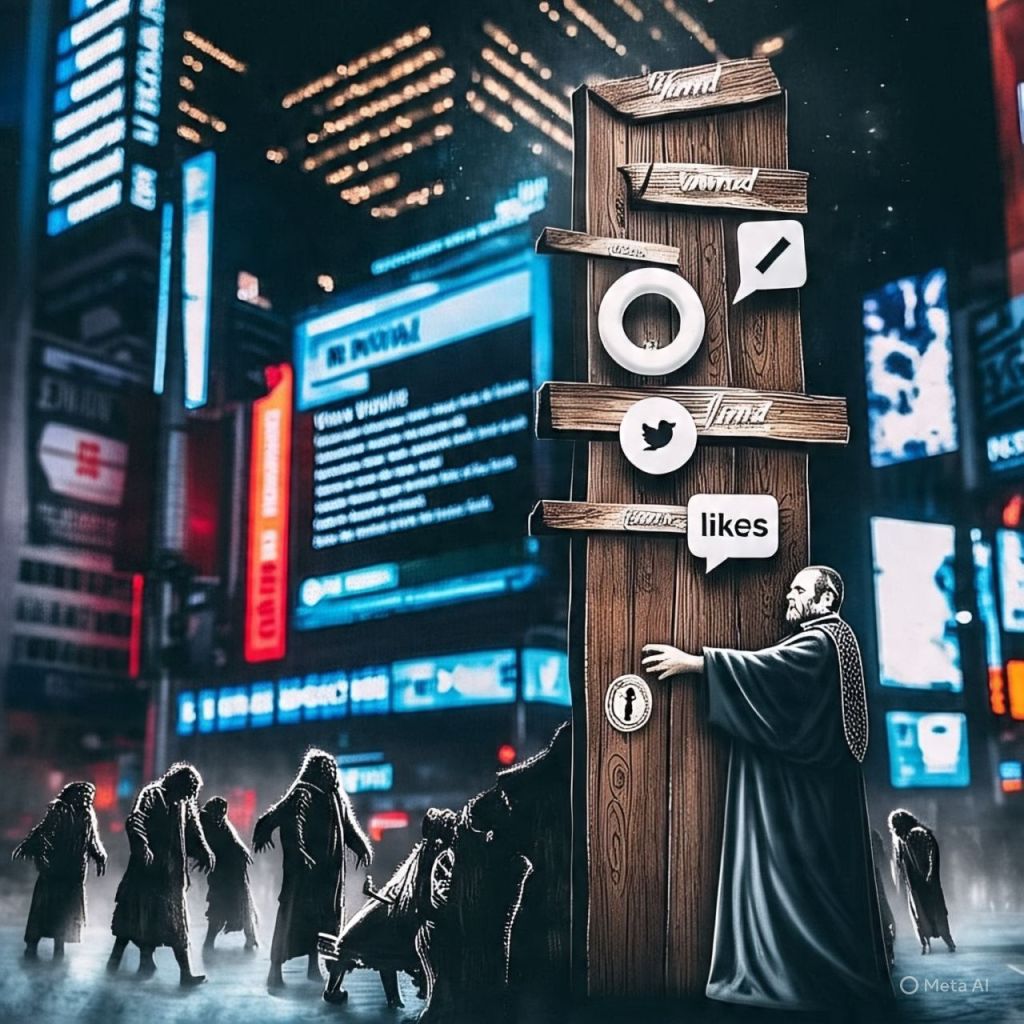 Dead followers walk through the city — faces blue-lit from old phones, moaning “@username…”