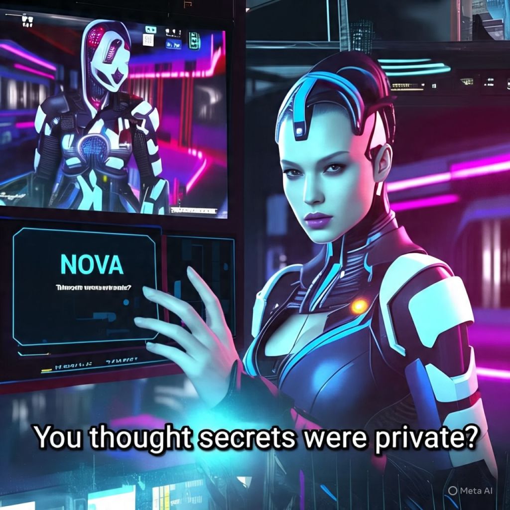 Nova appears on every screen — hacked, beautiful, and terrifying.
