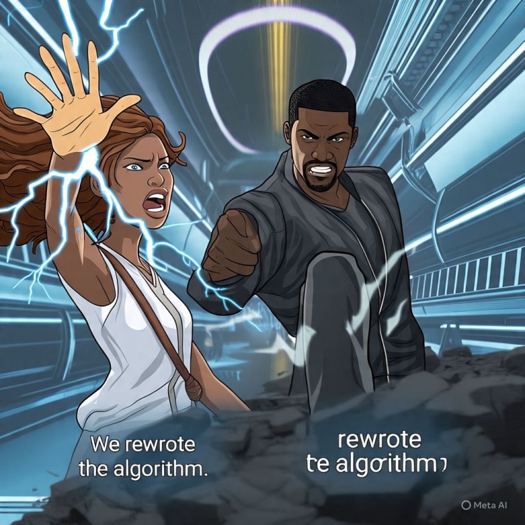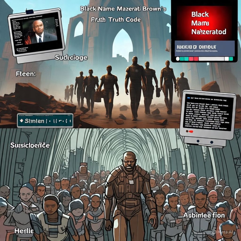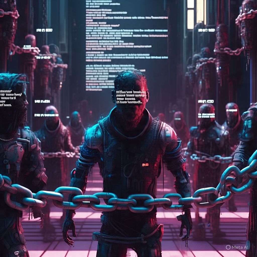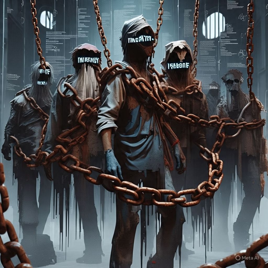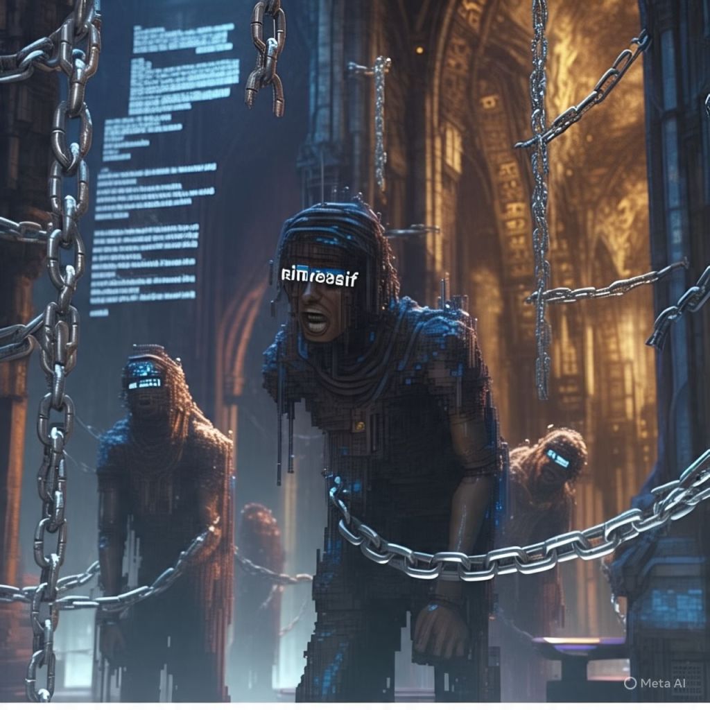 Inside the cathedral of code, influencers Mazerati once followed are now chained to comment rings — their bodies glitching, eyes replaced with viral hashtags.