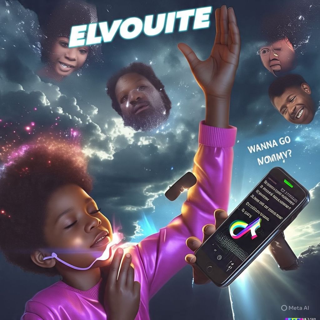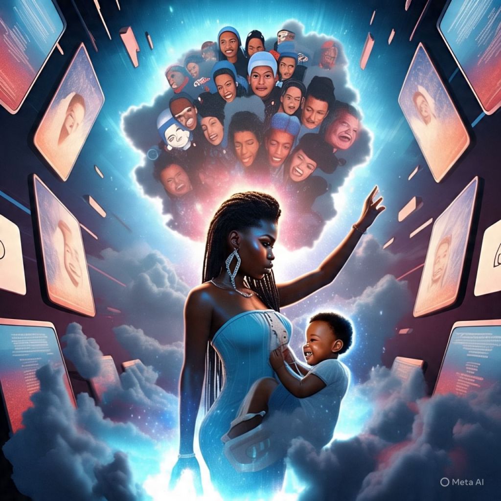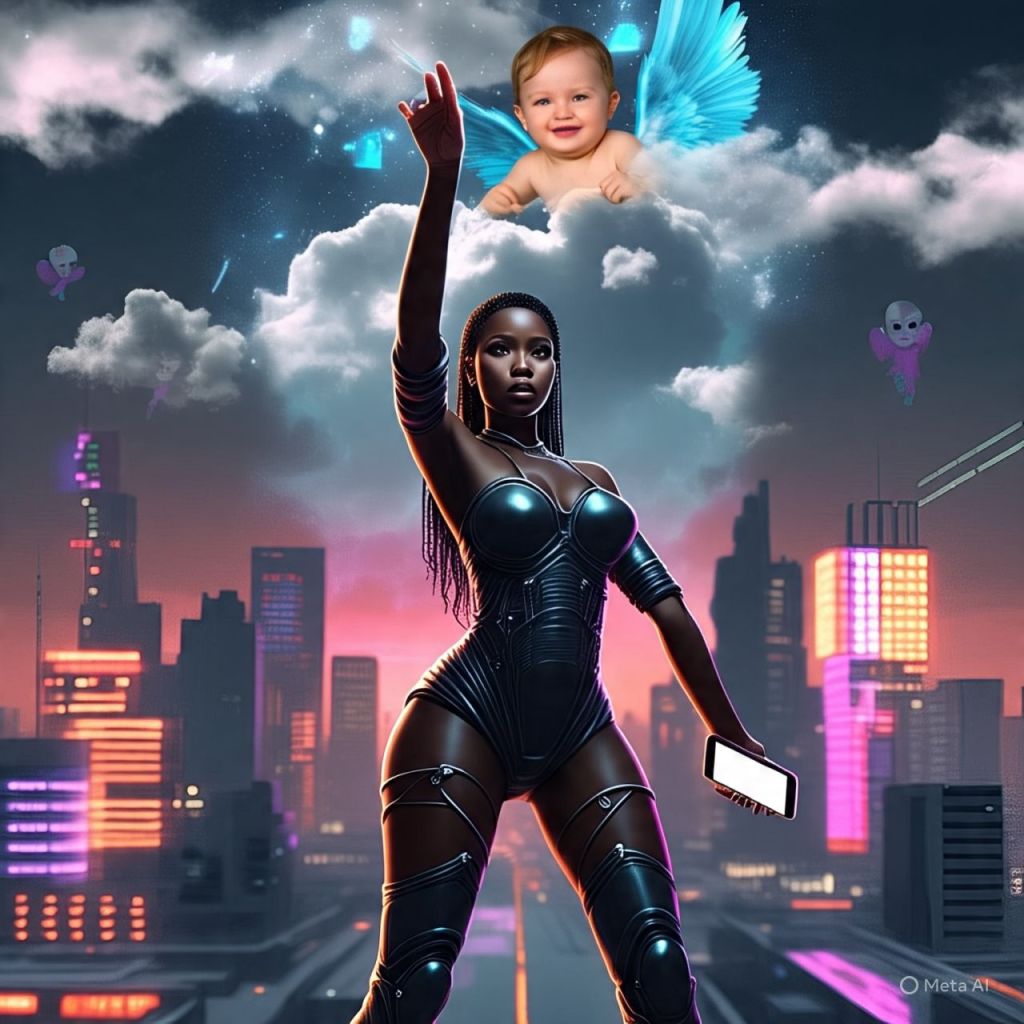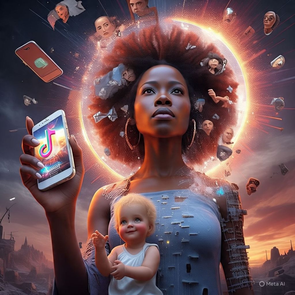 A baby influencer, reborn from the ashes of TikTok, holds a glowing phone and says: