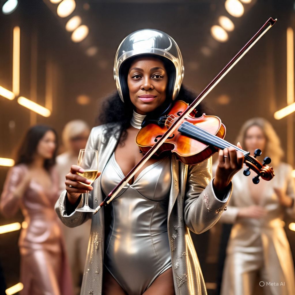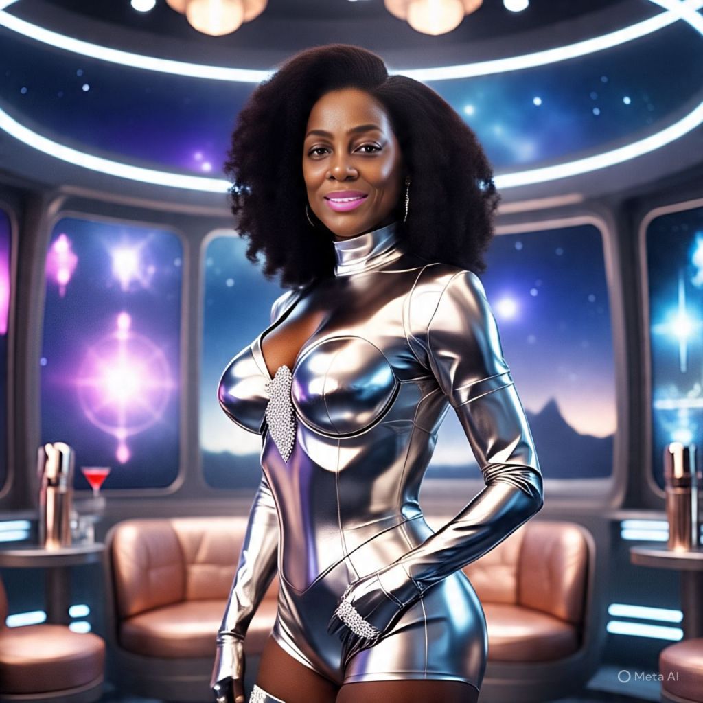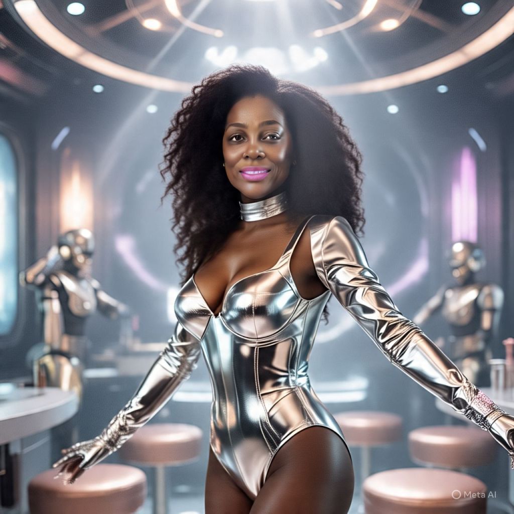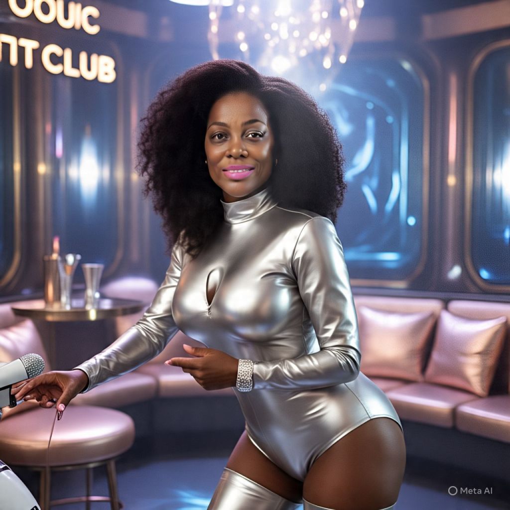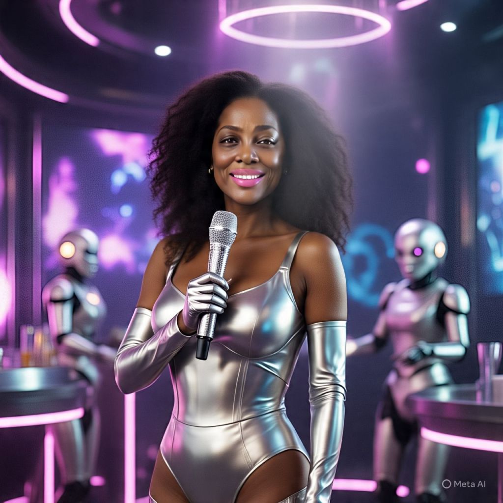 (Wearing a chrome bodysuit with thigh-high boots and a diamond mic)