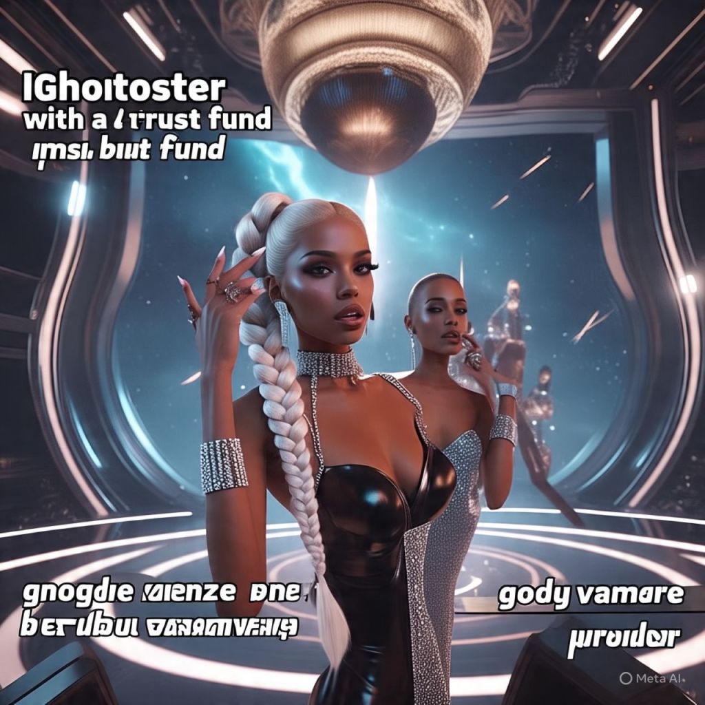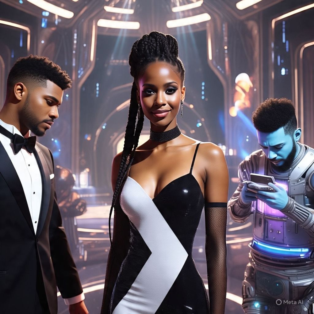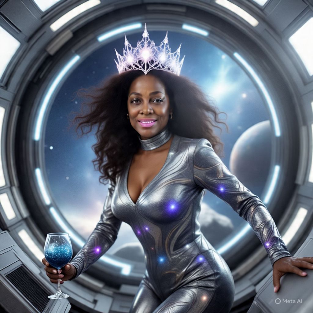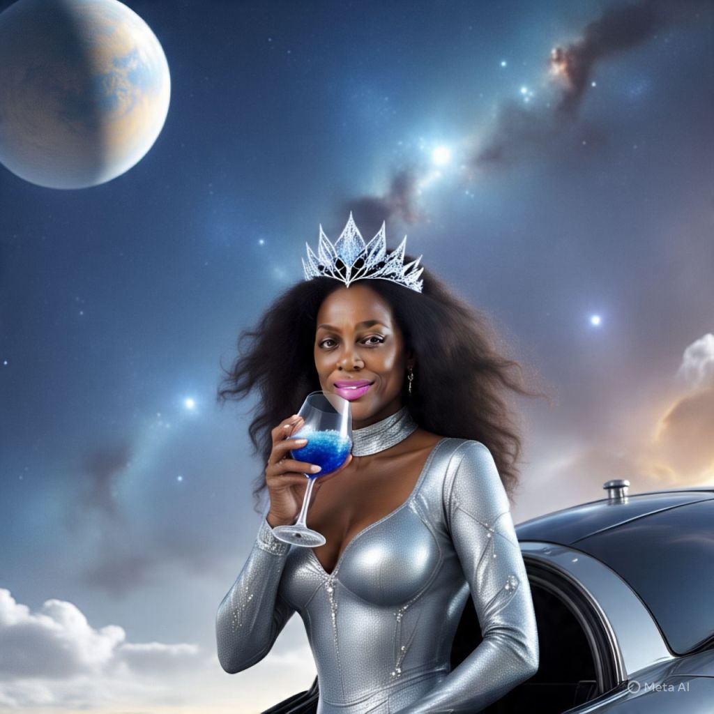 She steps out of her spaceship, sips from a crystal glass filled with blue stardust wine, and smirks.
